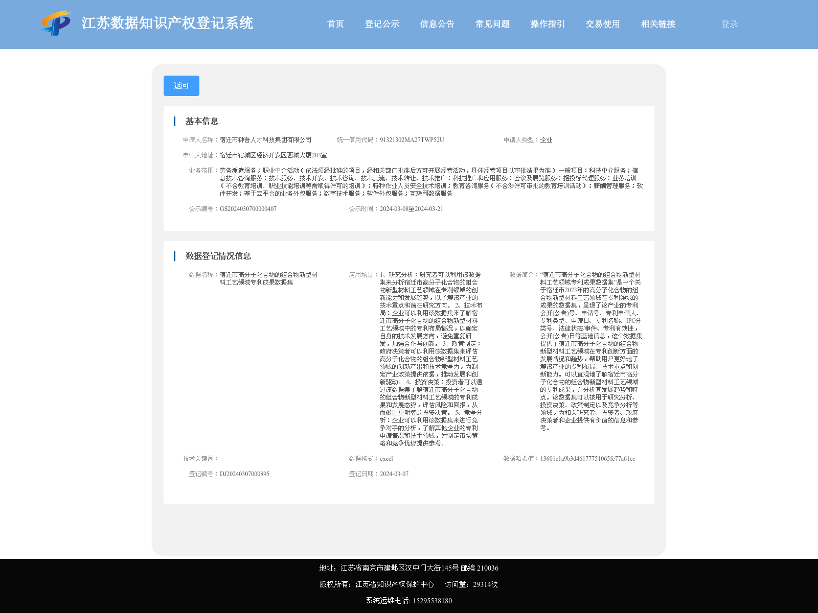 关于 江苏数据知识产权登记系统 , 由江苏省知识产权保护中心开发的系统,为依法取得、按照一定规则处理的、具有商业价值和智力成果属性的数据集提供登记服务。该系统依托江苏省知识产权大数据平台,支持对登记数据知识产权相关专利信息进行查询展示,并已与江苏省公证区块链对接。系统的上线为数据知识产权的协同保护提供了有力支撑,未来还将陆续推出数据知识产权交易等功能模块,促进数据知识产权的流通使用,助力江苏数字经济高质量发展。