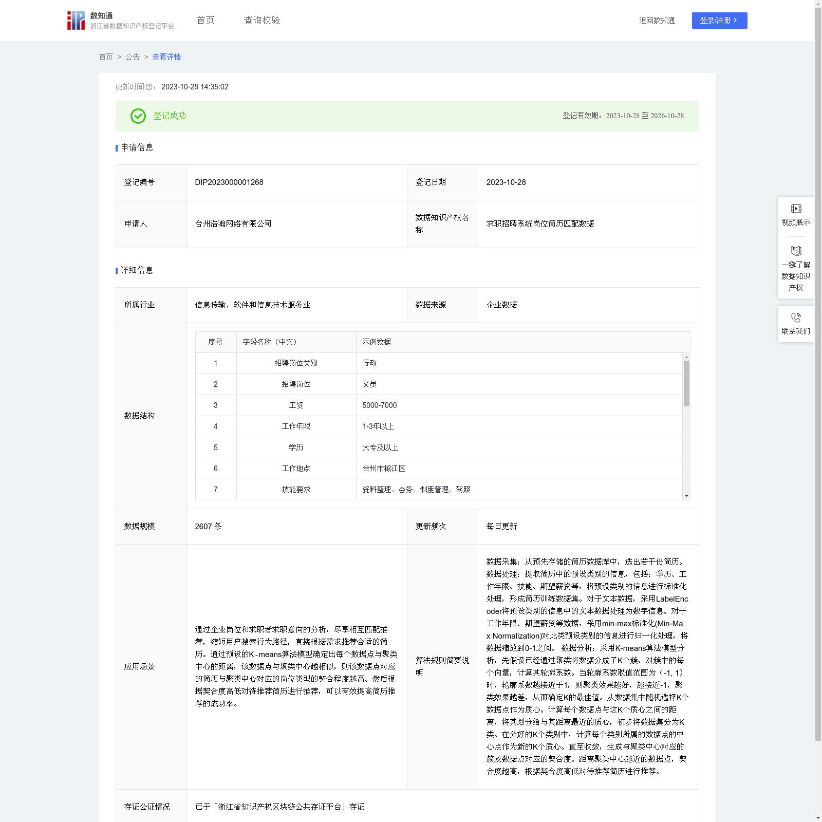 关于 台州浩瀚网络有限公司 , 台州浩瀚网络有限公司是一家经营范围广泛的公司,主要涉及广告设计、软件开发、信息咨询服务以及房地产经纪等多个领域。近期,该公司在数据领域也取得了显著成果。其求职招聘系统的多项数据资源,包括岗位简历匹配数据、企业招聘情况总结分析数据、岗位分析数据以及简历评分数据,都已在浙江省数据知识产权登记平台完成登记。这些数据集覆盖了求职招聘的多个关键环节,展现了台州浩瀚网络在数据处理和求职招聘领域的专业实力。