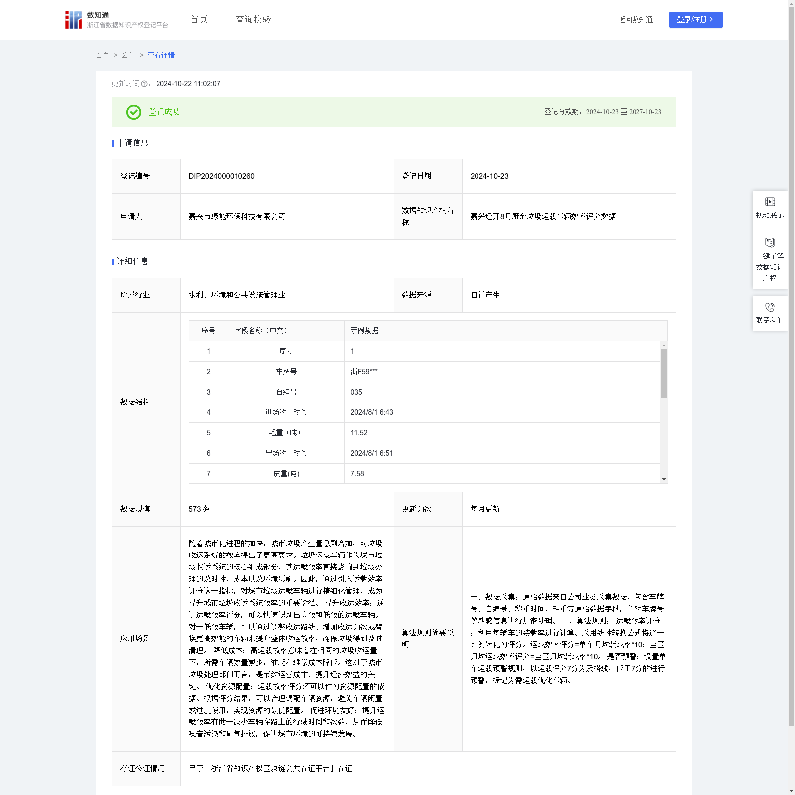 嘉兴市绿能环保科技有限公司 本次登记的数据知识产权 嘉兴经开8月厨余垃圾运载车辆效率评分数据, 随着城市化进程的加快,城市垃圾产生量急剧增加,对垃圾收运系统的效率提出了更高要求。垃圾运载车辆作为城市垃圾收运系统的核心组成部分,其运载效率直接影响到垃圾处理的及时性、成本以及环境影响。因此,通过引入运载效率评分这一指标,对城市垃圾运载车辆进行精细化管理,成为提升城市垃圾收运系统效率的重要途径。 提升收运效率:通过运载效率评分,可以快速识别出高效和低效的运载车辆。对于低效车辆,可以通过调整收运路线、增加收运频次或替换更高效能的车辆来提升整体收运效率,确保垃圾得到及时清理。 降低成本:高运载效率意味着在相同的垃圾收运量下,所需车辆数量减少,油耗和维修成本降低。这对于城市垃圾处理部门而言,是节约运营成本、提升经济效益的关键。 优化资源配置:运载效率评分还可以作为资源配置的依据。根据评分结果,可以合理调配车辆资源,避免车辆闲置或过度使用,实现资源的最优配置。 促进环境友好:提升运载效率有助于减少车辆在路上的行驶时间和次数,从而降低噪音污染和尾气排放,促进城市环境的可持续发展。一、数据采集:原始数据来自公司业务采集数据,包含车牌号、自编号、称重时间、毛重等原始数据字段,并对车牌号等敏感信息进行加密处理。 二、算法规则: 运载效率评分 :利用每辆车的装载率进行计算。采用线性转换公式将这一比例转化为评分。运载效率评分=单车月均装载率*10;全区月均运载效率评分=全区月均装载率*10。 是否预警:设置单车运载预警规则,以运载评分7分为及格线,低于7分的进行预警,标记为需运载优化车辆。