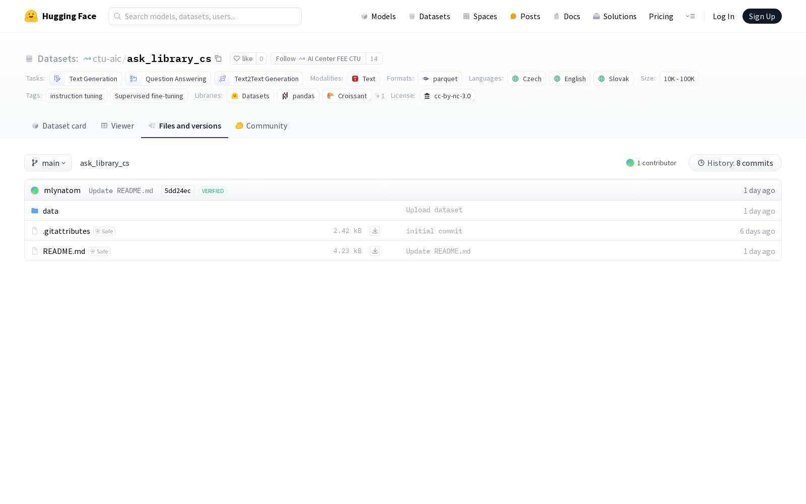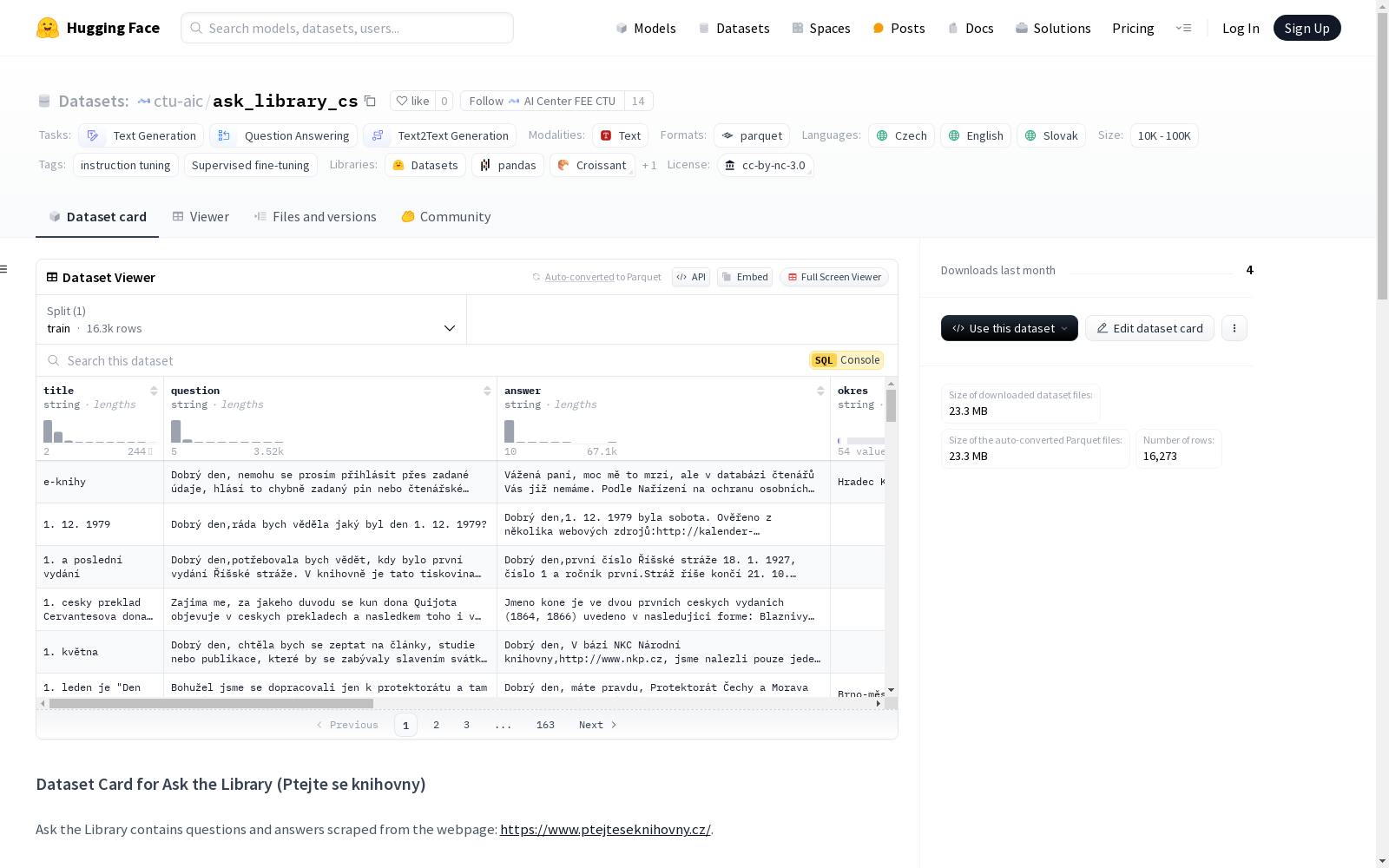 AI Center FEE CTU 本次发布的数据集 ask_library_cs, Ask the Library数据集包含从网页https://www.ptejteseknihovny.cz/抓取的问题和答案。问题涵盖了广泛的主题,如历史、语言、生物等。数据集由AIC FEE CTU策划,主要语言为捷克语,使用CC-BY-NC 3.0许可证。数据集可用于指令调优、问答和其他NLP任务。数据集包含一个训练集,包含以下字段:标题、问题、答案、图书馆所在地的Okres(NUTS4)、图书馆名称、问题类别、使用的来源、提问日期、问题URL、行ID和检测到的语言。数据集的创建动机是缺乏可用的捷克语指令调优数据集。数据来源是捷克图书馆的员工和用户。