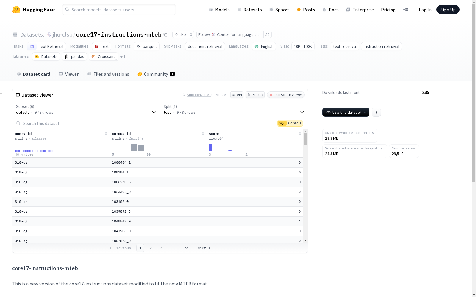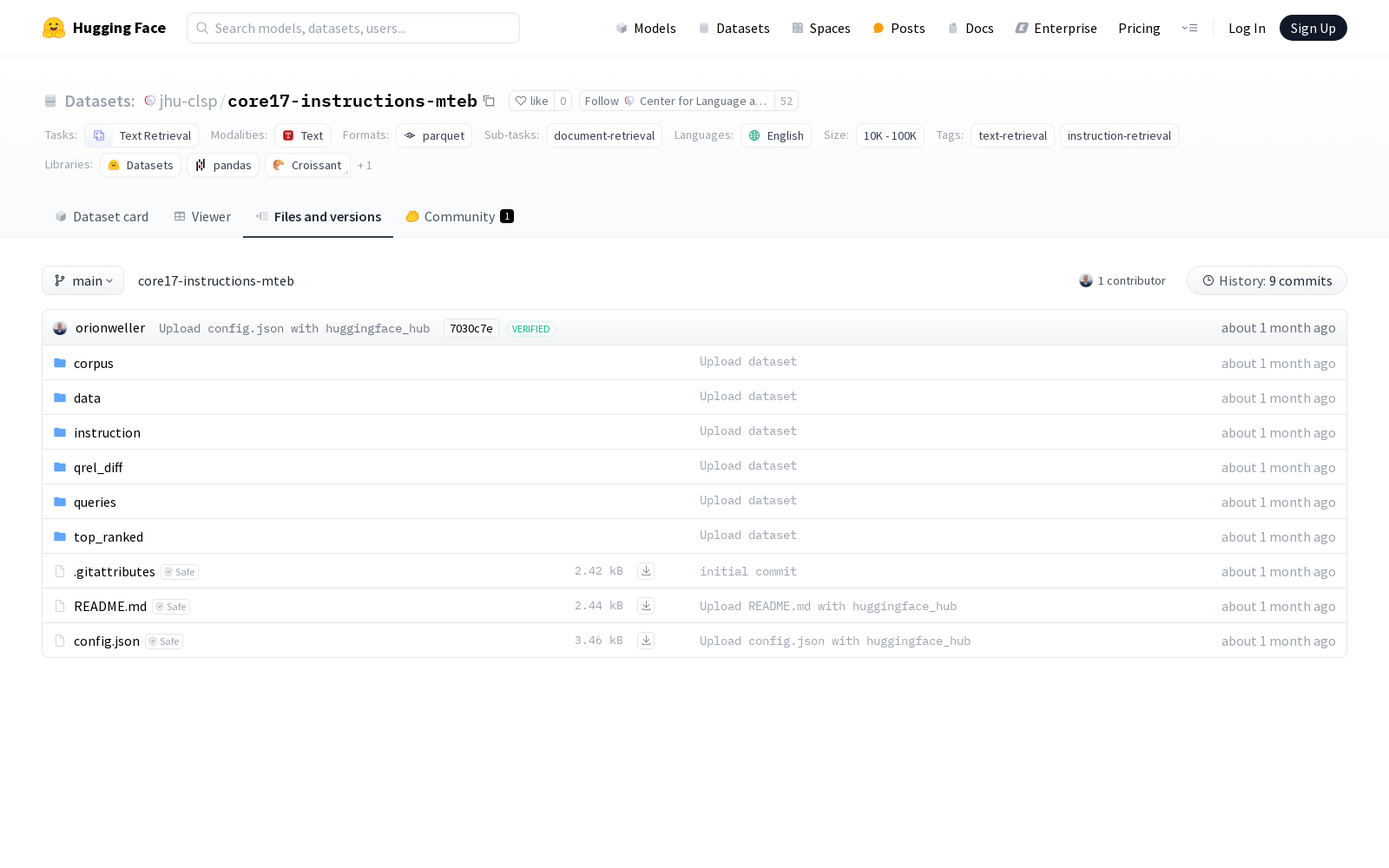 Center for Language and Speech Processing @ JHU 本次发布的数据集 core17-instructions-mteb, 数据集core17-instructions-mteb是一个经过修改以适应新MTEB格式的core17-instructions数据集的新版本。它包含了多个配置,每个配置都有特定的数据文件和特征。具体配置包括:corpus(原始语料库文档)、queries(包含原始和修改版本的查询)、instruction(原始和修改查询的指令)、default(原始相关性判断)、qrel_diff(相关性判断的变化)、top_ranked(每个查询的顶级文档)。每个配置都有其特定的特征和分割,如corpus配置包含文档的ID、标题和文本,而queries配置包含查询的ID和文本。数据集主要用于文本检索和指令检索任务,语言为英语,是单语种数据集。