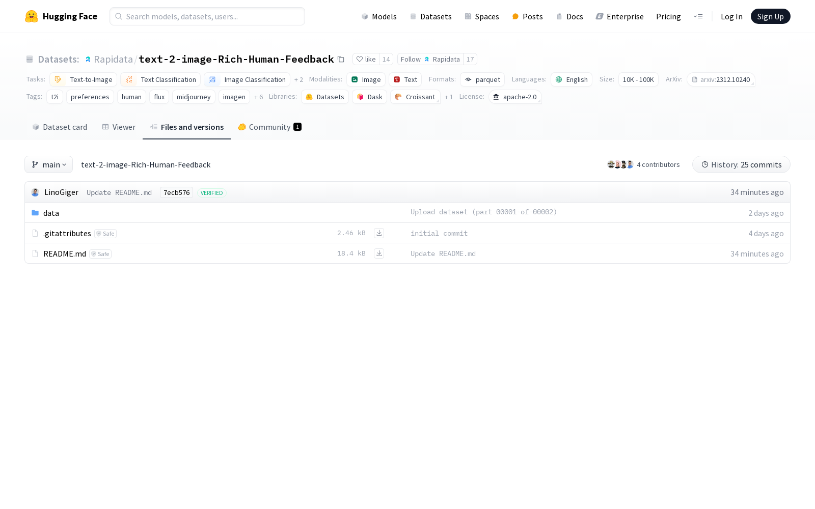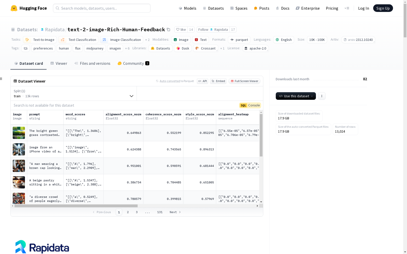 本次发布的数据集 text-2-image-Rich-Human-Feedback, 该数据集名为“Rich Human Feedback for Text to Image Models”,主要用于评估AI生成的图像在风格、连贯性和提示对齐性方面的表现。数据集包含了超过150万条来自152,684个独立人类的反馈,收集过程耗时约5天。数据集的特征包括图像、提示词、单词评分、对齐评分、连贯性评分、风格评分等。数据集还提供了热图数据,用于进一步分析图像与提示词的对齐情况。数据集的用途包括文本到图像生成、文本分类、图像分类、图像到文本生成和图像分割等任务。