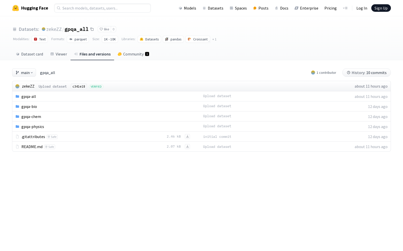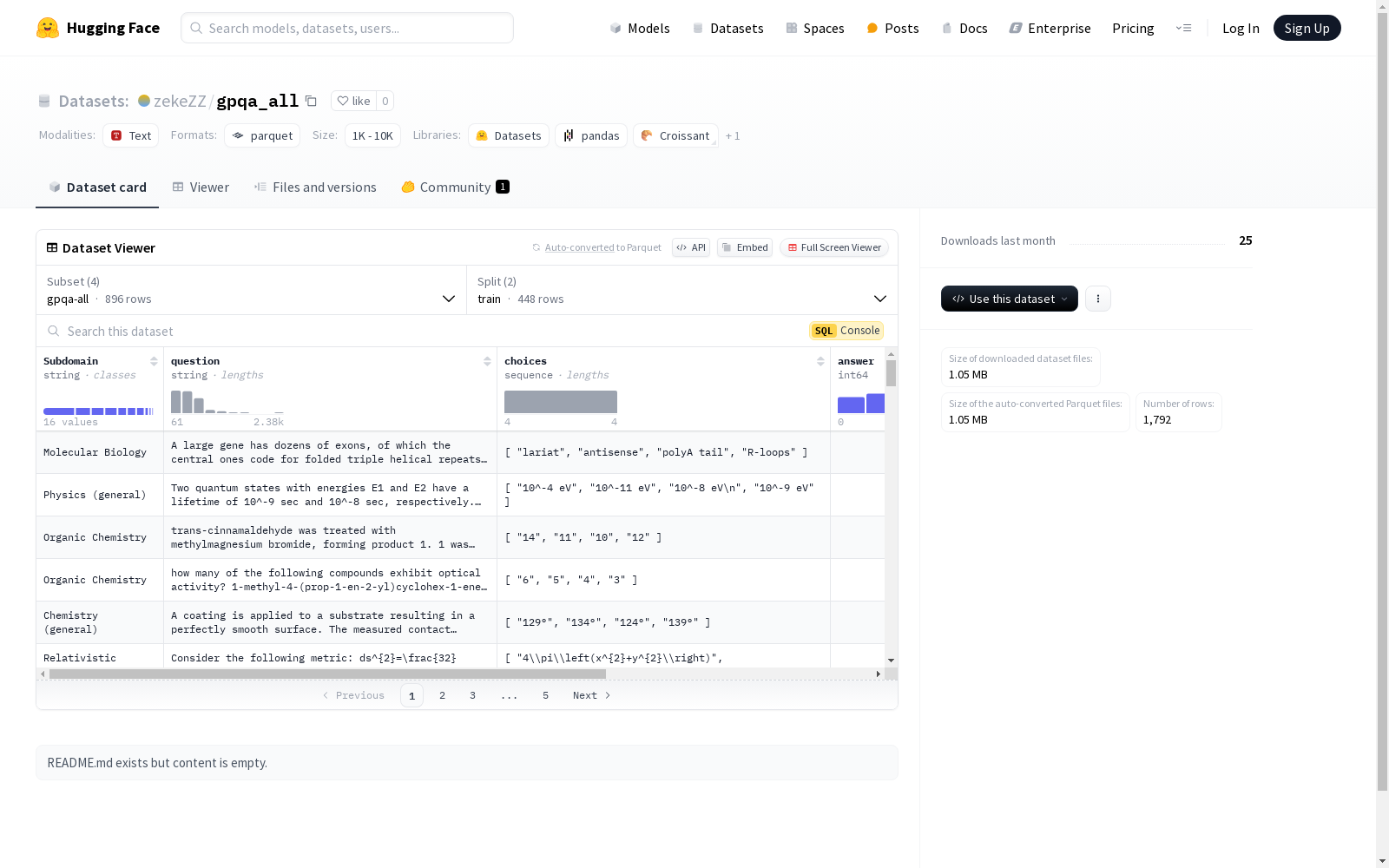本次发布的数据集 gpqa_all, 该数据集包含多个配置,分别针对不同的子领域(如生物、化学、物理等)。每个配置包含问题、选项、答案和文本等特征。数据集分为训练集和测试集,每个分割的字节数和示例数已列出。