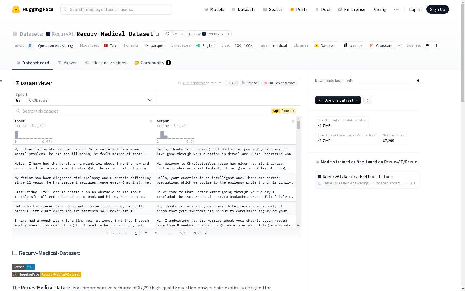 本次发布的数据集 Recurv-Medical-Dataset, Recurv-Medical-Dataset是一个包含67,299个高质量问答对的综合资源,专门设计用于训练和微调医疗AI模型。该数据集从可信的医学来源中精选,重点关注现实世界中的场景,如病史采集、诊断和治疗建议。它为推进医疗领域的对话AI设定了新的基准。数据来源包括PubMed和开放获取期刊、临床实践指南(如WHO、CDC)、医学教科书、电子健康记录模拟数据以及同行评审的研究论文。