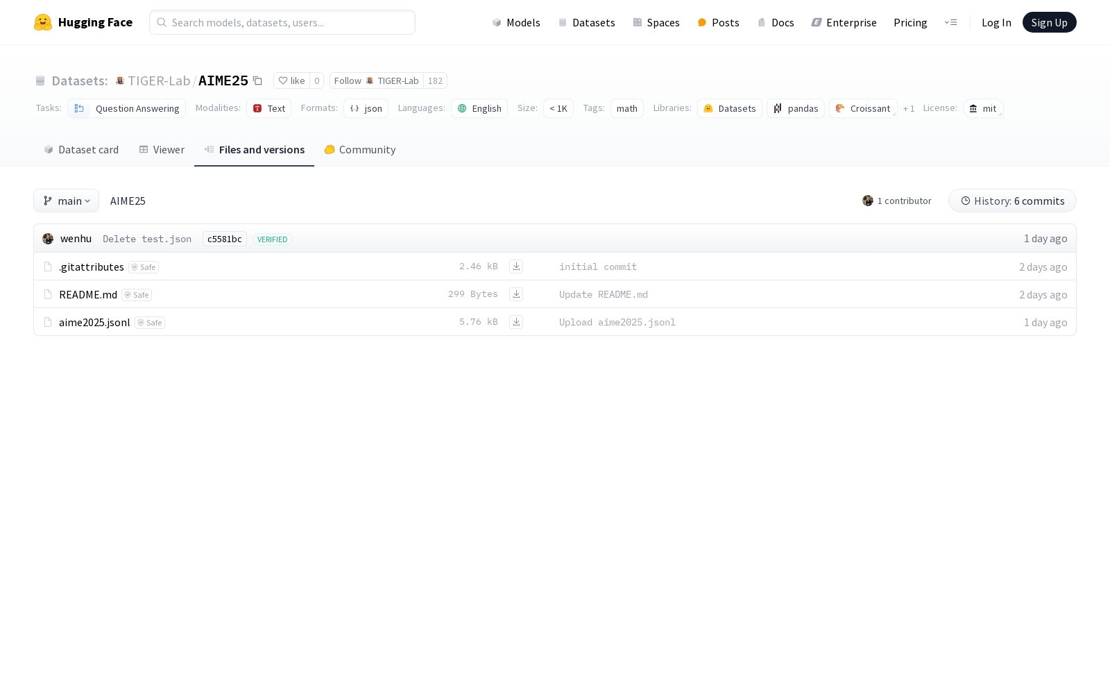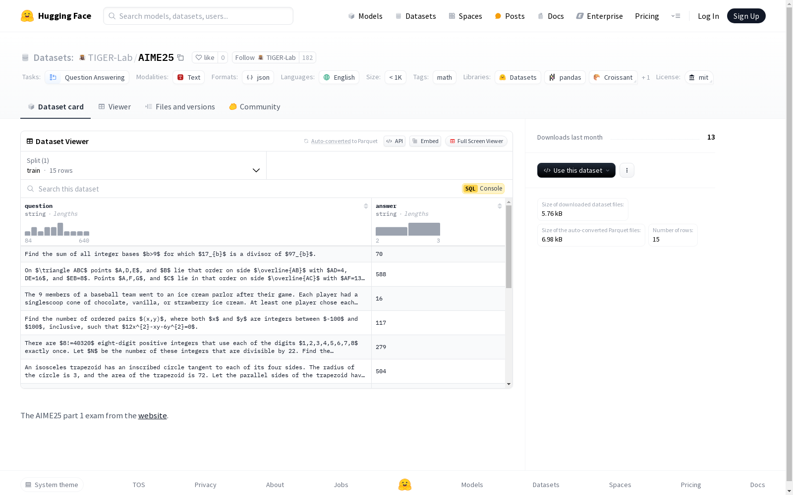 TIGER-Lab 本次发布的数据集 AIME25, aime25数据集是一个包含数学问题的答案的数据集,具体来源于2025年美国数学邀请赛(AIME)第一部分的考试题目。该数据集适用于问题回答任务,数据集大小小于1000条记录,语言为英语。