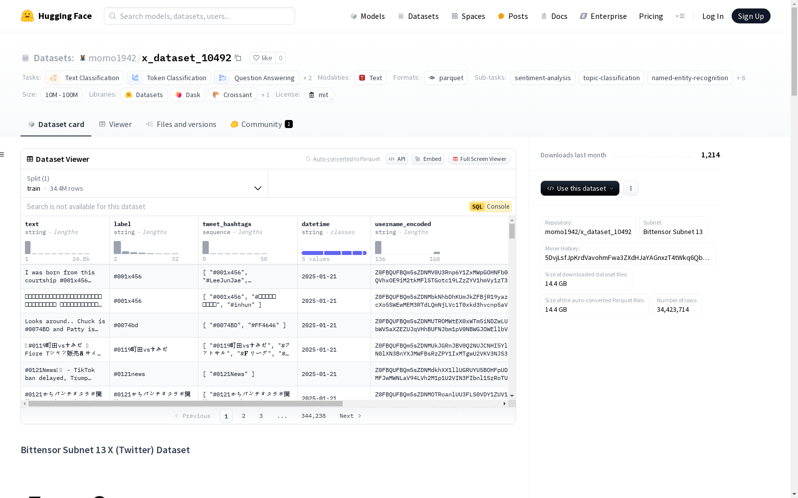 本次发布的数据集 x_dataset_10492, Bittensor Subnet 13 X (Twitter) 数据集是Bittensor Subnet 13去中心化网络的一部分,包含了来自X(原Twitter)的预处理推文数据。这个数据集不断更新,提供实时推文流,适用于各种分析和机器学习任务。数据集支持多种任务,例如情感分析、趋势检测、内容分析和用户行为建模。数据集主要是英文,但也可能是多语言的。数据集没有固定的切分,用户需要根据需求和时间戳来创建自己的切分。