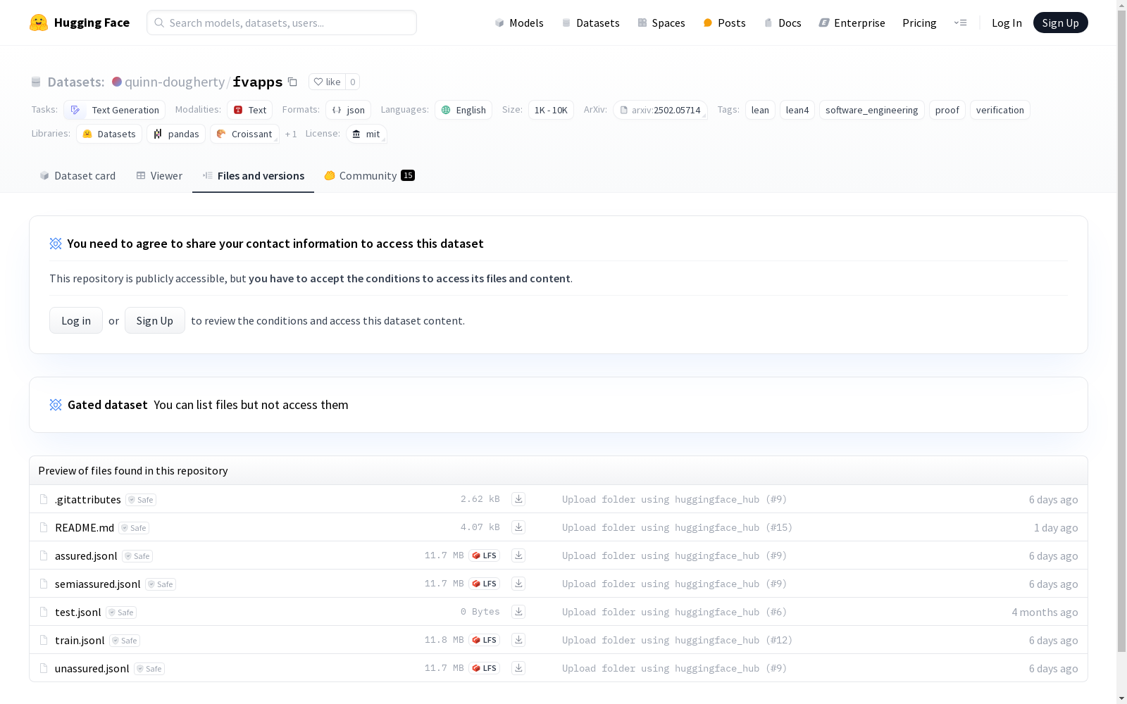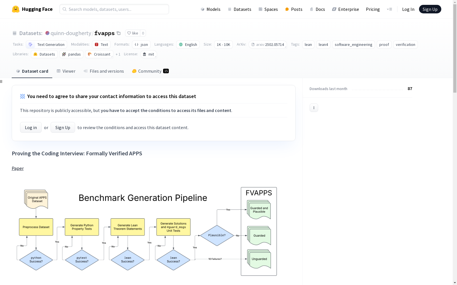 Beneficial AI Foundation 本次发布的数据集 Formally Verified Automated Programming Progress Standards (FVAPPS), FVAPPS是一个包含4715个样本的数据集,用于编写程序并证明其正确性,是迄今为止最大的形式验证基准。该数据集由Beneficial AI Foundation和Independent共同开发,基于APPS数据集,包含自然语言问题、难度标记、Python中的正确解决方案以及一些输入输出测试对。数据集通过Anthropic的Claude Sonnet 3.53模型生成,旨在为定理证明和程序合成提供基准。