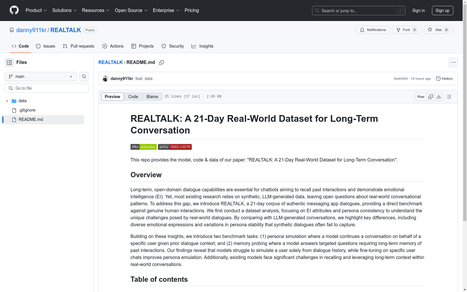 南加州大学 本次发布的数据集 REALTALK, REALTALK是一个真实世界的长期对话数据集,由10对个体在21天内通过消息应用进行的真实对话组成。数据集包含大约16,000个词/对话,旨在通过直接比较真实世界对话和大型语言模型生成的对话,来研究情感智能属性和角色一致性等挑战。该数据集用于评估模型在长期对话中的情感智能和角色模拟能力,并为开发更加人性化的记忆感知AI提供基准任务。