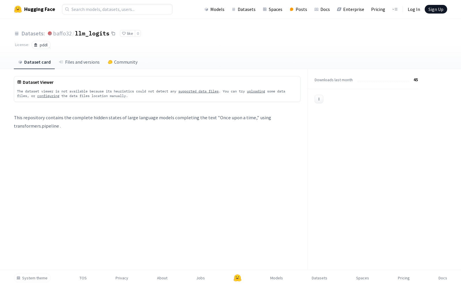 本次发布的数据集 llm_logits, 该数据集包含使用transformers.pipeline方法生成的故事开头从前有个时候的大型语言模型的隐藏状态数据。