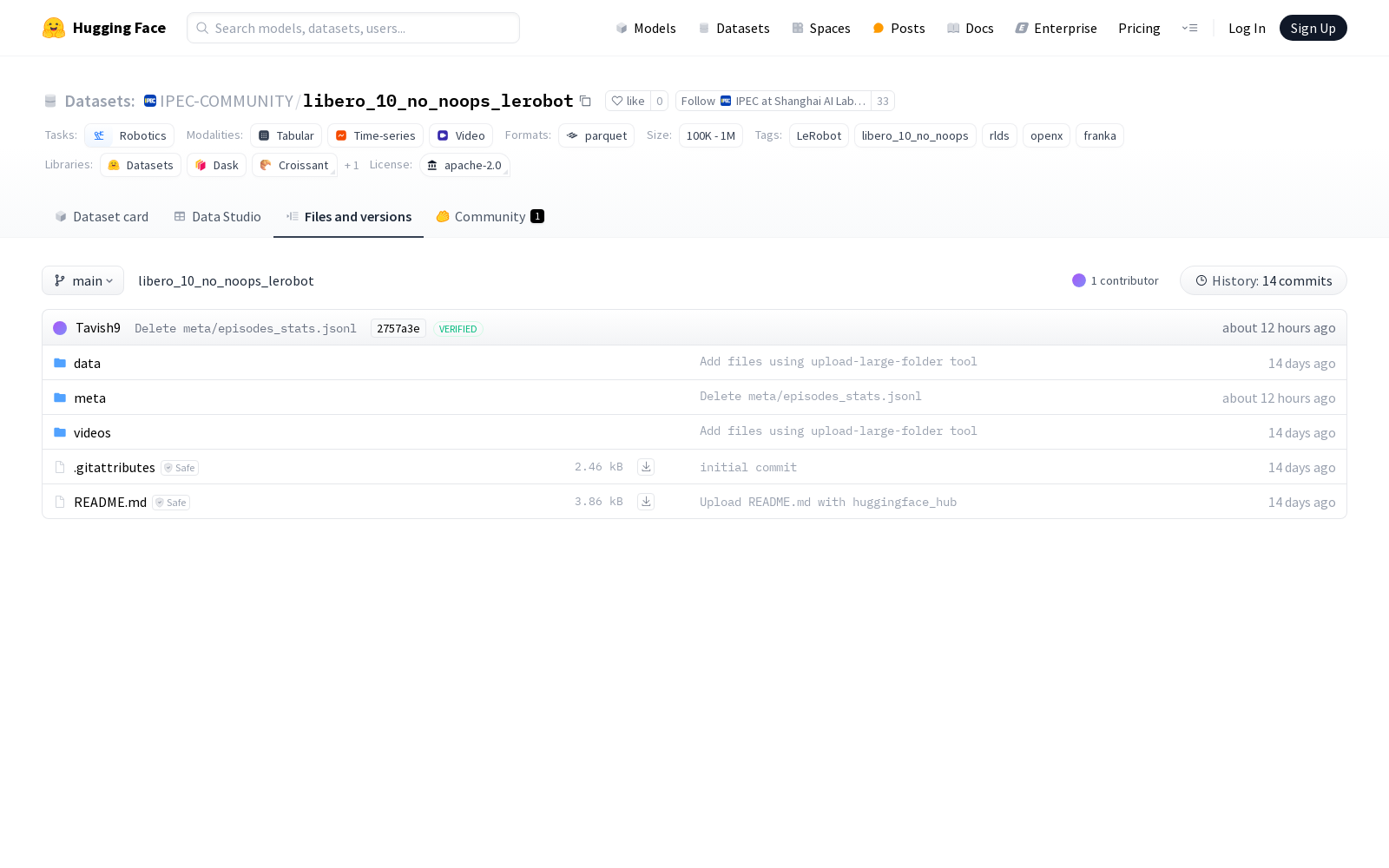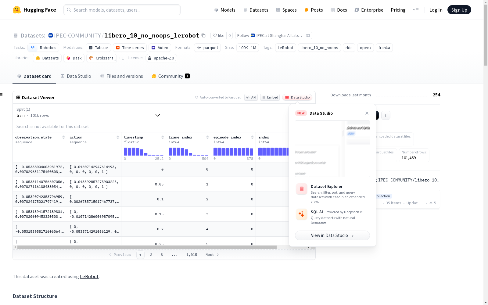 本次发布的数据集 libero_10_no_noops_lerobot, 这是一个与机器人学相关的数据集,使用LeRobot创建。数据集包含了多种类型的观察数据(例如手腕图像、一般图像、状态等)和动作数据。它总共包含了379个剧集、101469帧和10个任务。数据集的结构在meta/info.json文件中详细描述,其中包括了机器人类型、总剧集数、总帧数、任务数等信息。该数据集遵循Apache-2.0许可。