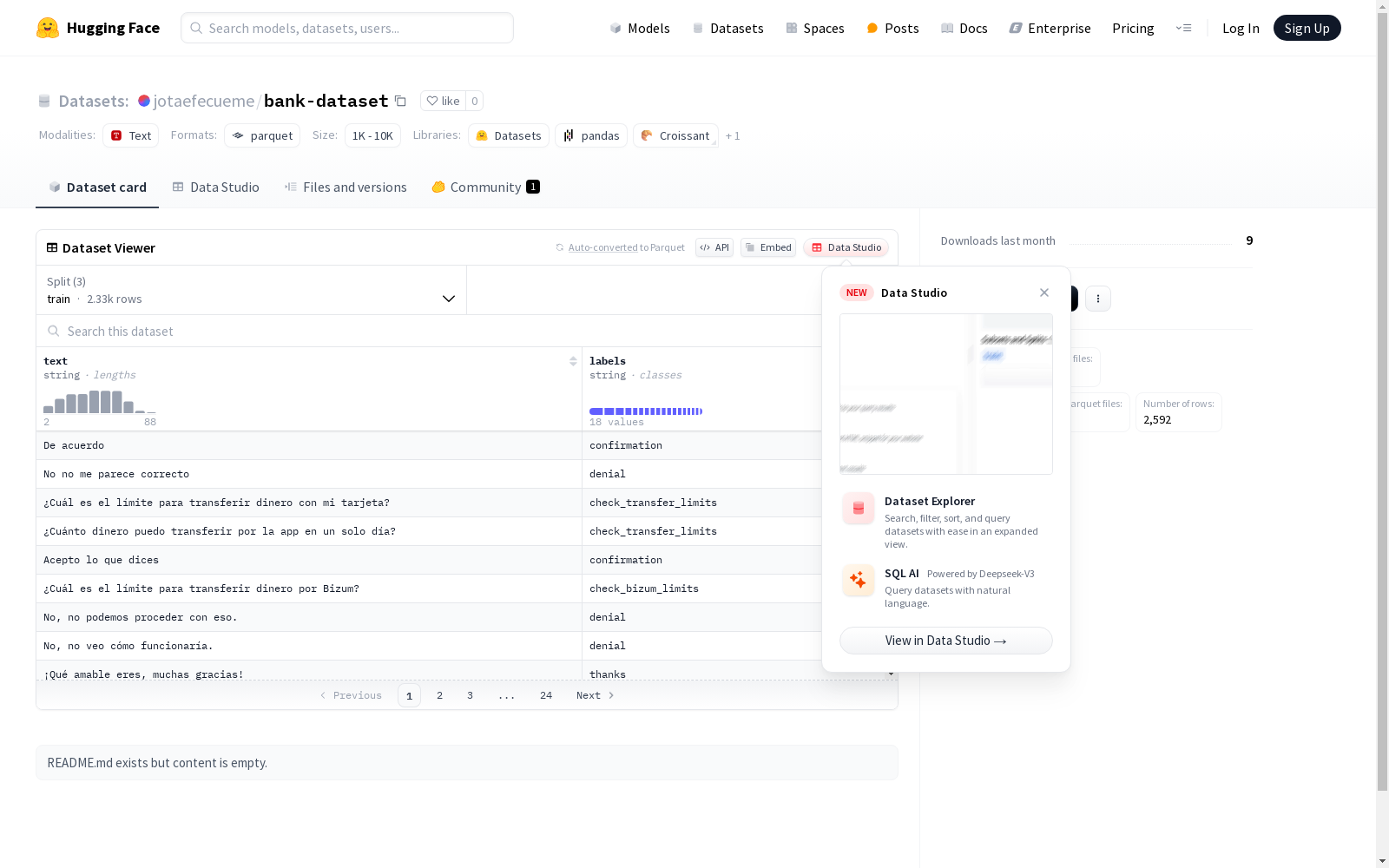 本次发布的数据集 bank-dataset, 这是一个包含文本和标签的数据集,由训练集、验证集和测试集组成。训练集包含2332个示例,验证集包含259个示例,测试集包含1个示例。数据集的总大小为167090字节,下载大小为65098字节。