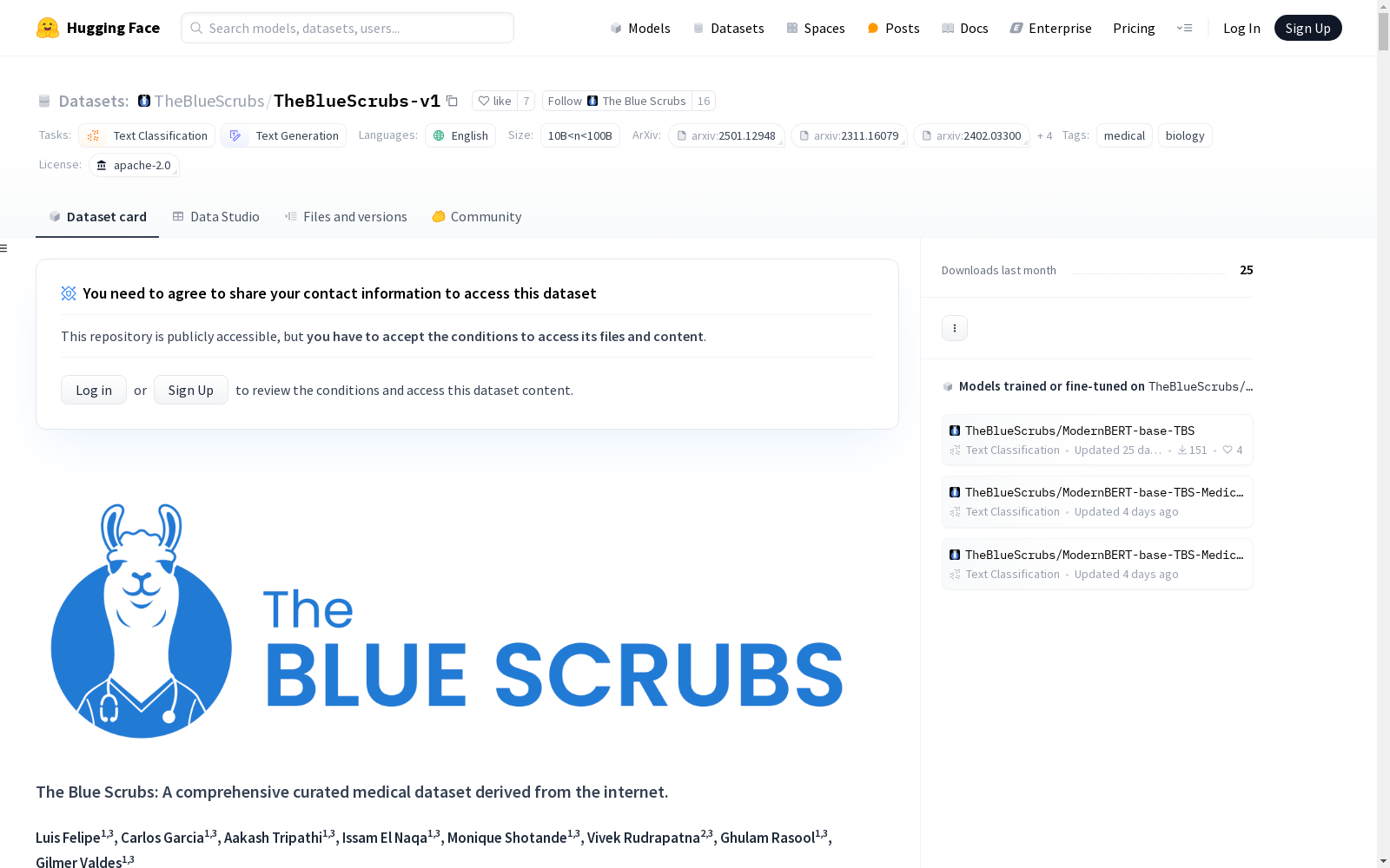 莫菲特癌症中心 本次发布的数据集 TheBlueScrubs-v1, TheBlueScrubs-v1是由莫菲特癌症中心等机构创建的医学数据集,从互联网上广泛收集,包含了超过25亿个医学Token,是PubMed的三倍之大。数据集由11.5百万份文档组成,每份文档都经过细致的医疗相关性和质量评估,标注有医学概率分数、三个大型语言模型评估的质量分数以及癌症相关标签。该数据集旨在为医学大型语言模型的开发提供支持,能够应用于模型训练、合成数据生成、错误信息检测和安全测试等多个领域。