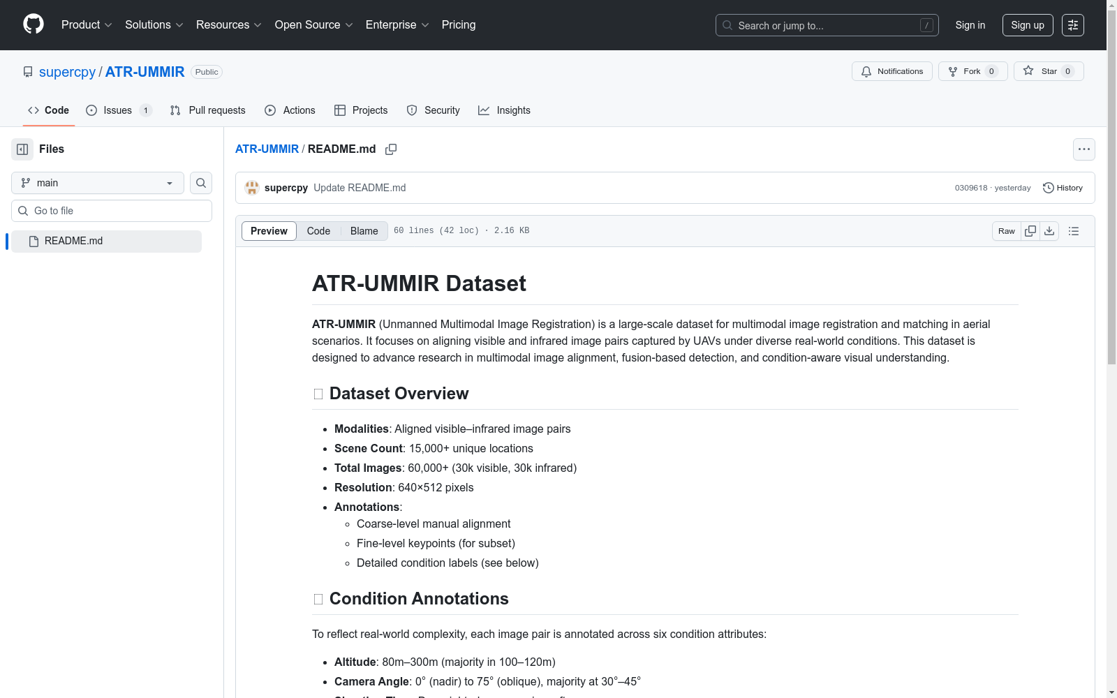 国防科技大学 本次发布的数据集 ATR-UMMIR, ATR-UMMIR是一个专为无人机多模态图像配准设计的基准数据集,包含7,969个图像三元组,包括高分辨率原始可见光图像、原始红外图像和精确配准的可见光图像。数据集涵盖了从80米到300米的飞行高度、0°到75°的相机角度,以及全年全天候的天气和光照条件。ATR-UMMIR为每个三元组引入了可靠的像素级真实值,并标注了六个成像条件属性,以评估配准的鲁棒性。此外,数据集还提供了对象级注释,涵盖了11个对象类别,总计有77,753个可见光和78,409个红外边框。ATR-UMMIR旨在推进无人机场景下的多模态配准、融合和感知研究。