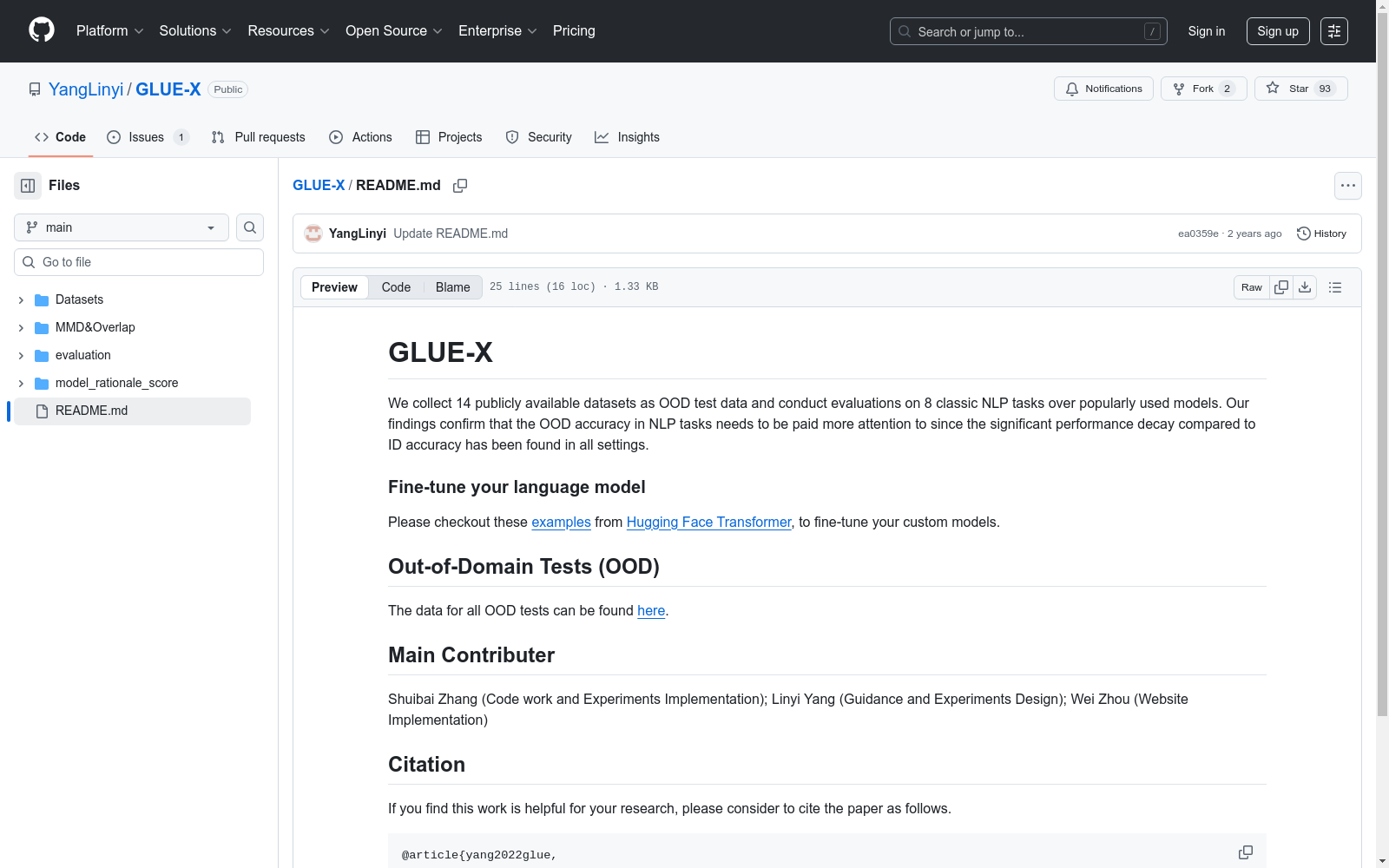 本次发布的数据集 GLUE-X, 该数据集是对GLUE基准的扩展,包括了额外的挑战内容。此外,它还针对离分布(OOD)性能进行了评估,属于自然语言理解任务范畴。