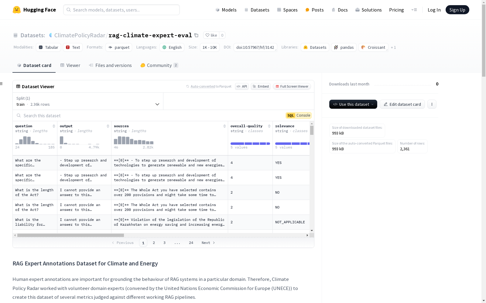 Climate Policy Radar 本次发布的数据集 rag-climate-expert-eval, 该数据集是一个由气候和能源领域专家提供的人工标注集合,用于评估RAG系统的表现。它包含2,361个对1,138个查询的标注,涉及多个RAG管道。标注指标包括整体质量、相关性、忠实度和CPR生成策略。数据集使用不同的管道生成,每个管道由生成模型、提示类型和检索参数定义。标注由来自国际组织的16位能源专家提供,数据集采用CC-by-4.0许可。该数据集旨在通过多样化的标注偏好来分析RAG管道。