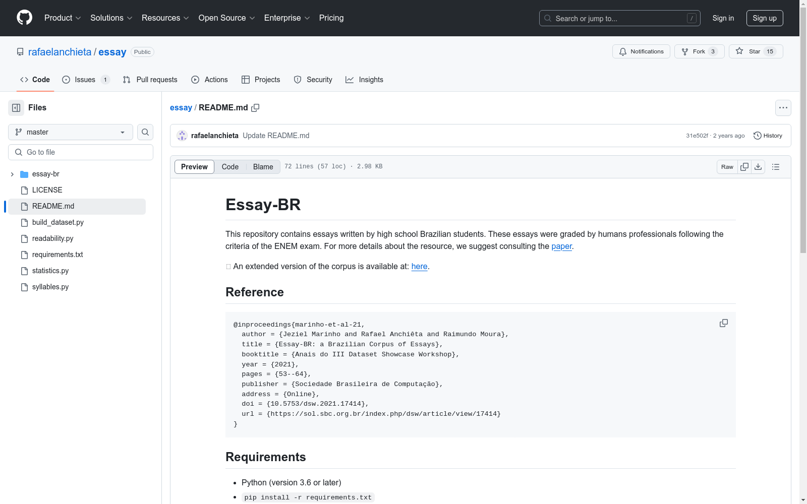 巴西皮奥伊联邦大学 本次发布的数据集 Essay-BR, Essay-BR是一个由巴西皮奥伊联邦大学创建的大型语料库,包含4570篇由巴西高中生撰写的议论文,这些文章通过在线平台收集,并由专家根据ENEM考试的五个能力维度进行评分。数据集涵盖了从2015年到2020年的319个主题,包括人权、政治问题等。创建过程中,使用了网络爬虫从两个公共网站提取文章,并进行了预处理和评分标准化。该数据集旨在支持葡萄牙语自动作文评分研究,帮助开发更有效的评分模型,以解决教育评估中的自动化问题。