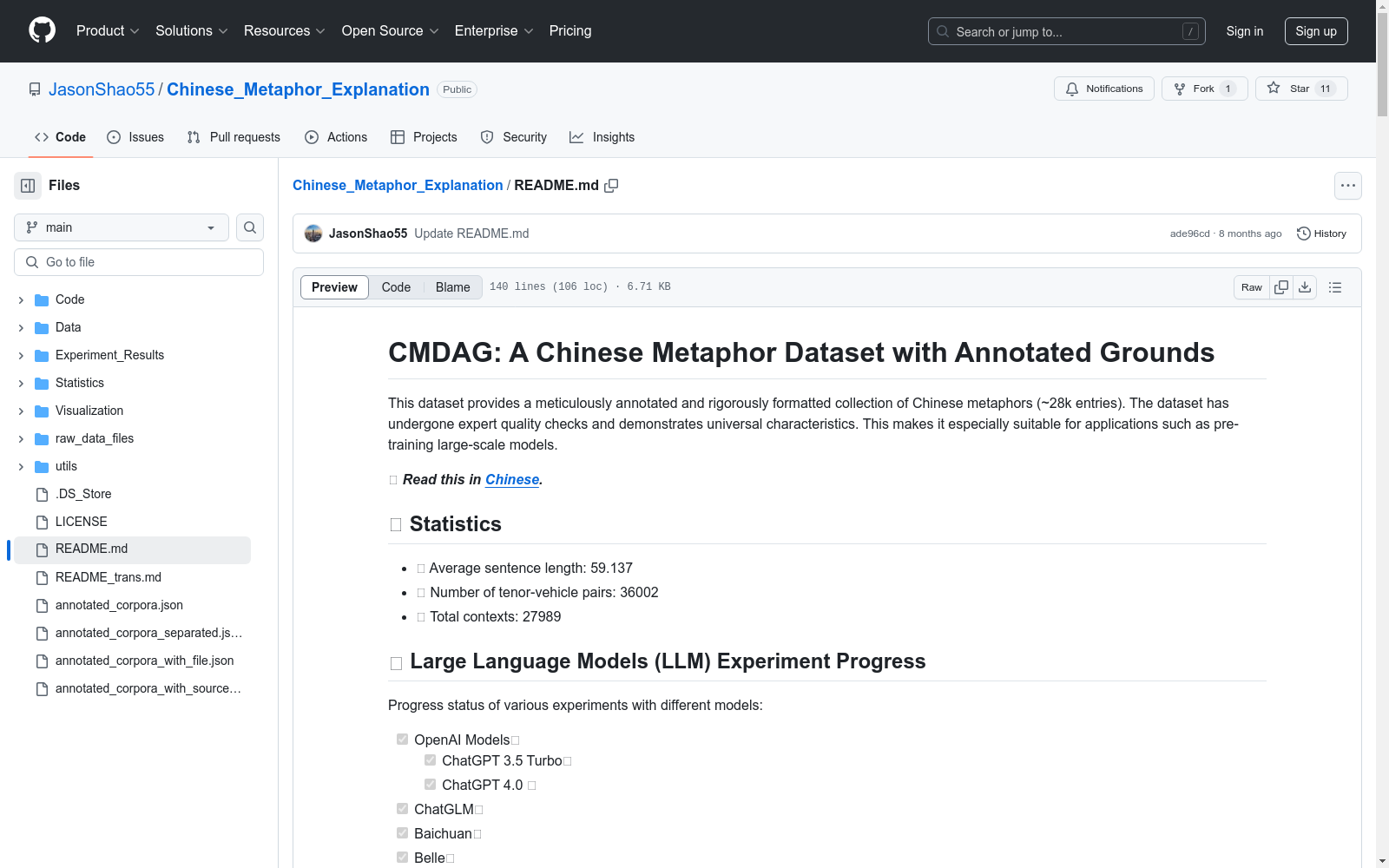 香港科技大学 本次发布的数据集 CMDAG, CMDAG是一个由香港科技大学等机构合作创建的大型中文隐喻数据集,包含约28,000条从多种中文文学来源(如诗歌、散文、歌词等)提取的句子。该数据集特别之处在于每条隐喻句子都附带有其对应的‘喻意’(GROUNDS)。创建过程中,研究团队利用了专业的标注者进行精细标注,确保了数据的质量和一致性。CMDAG数据集主要用于支持中文隐喻生成的研究,特别是在机器学习和自然语言处理领域,旨在提高模型生成隐喻句子的创造性和流畅性。