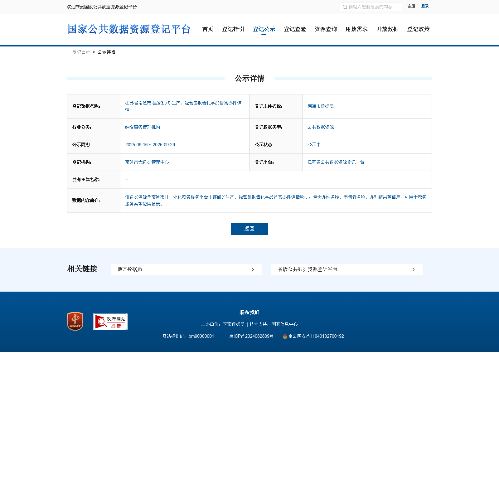 南通市数据局 本次登记的公共数据资源 江苏省南通市-国家机构-生产、经营易制毒化学品备案办件详情, 该数据资源为南通市县一体化政务服务平台里存储的生产、经营易制毒化学品备案办件详情数据,包含办件名称、申请者名称、办理结果等信息,可用于政务服务类等应用场景。
