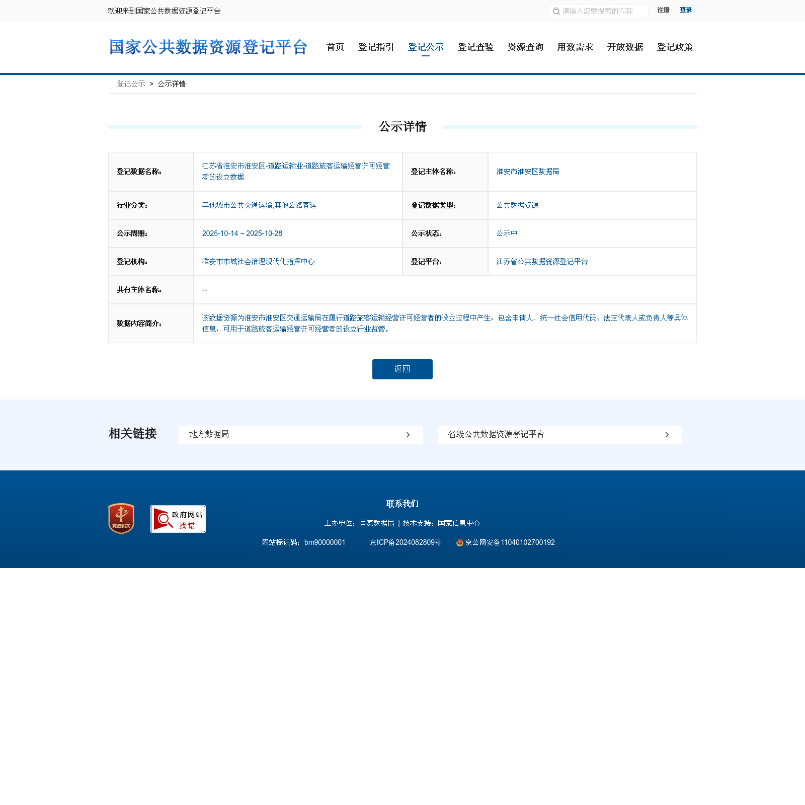 淮安市淮安区数据局 本次登记的公共数据资源 江苏省淮安市淮安区-道路运输业-道路旅客运输经营许可经营者的设立数据, 该数据资源为淮安市淮安区交通运输局在履行道路旅客运输经营许可经营者的设立过程中产生,包含申请人、统一社会信用代码、法定代表人或负责人等具体信息,可用于道路旅客运输经营许可经营者的设立行业监管。
