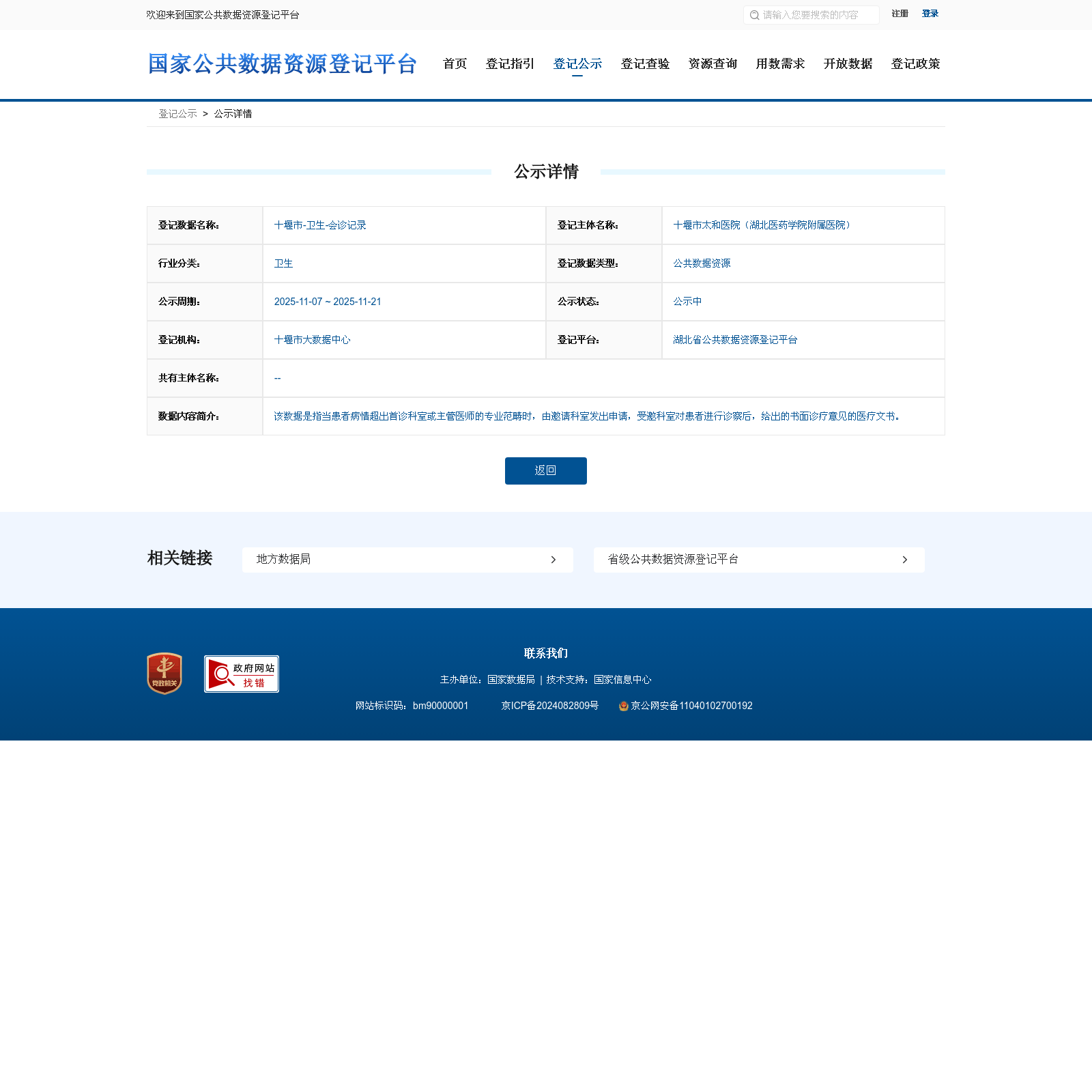 十堰市太和医院(湖北医药学院附属医院) 本次登记的公共数据资源 十堰市-卫生-会诊记录, 该数据是指当患者病情超出首诊科室或主管医师的专业范畴时,由邀请科室发出申请,受邀科室对患者进行诊察后,给出的书面诊疗意见的医疗文书。