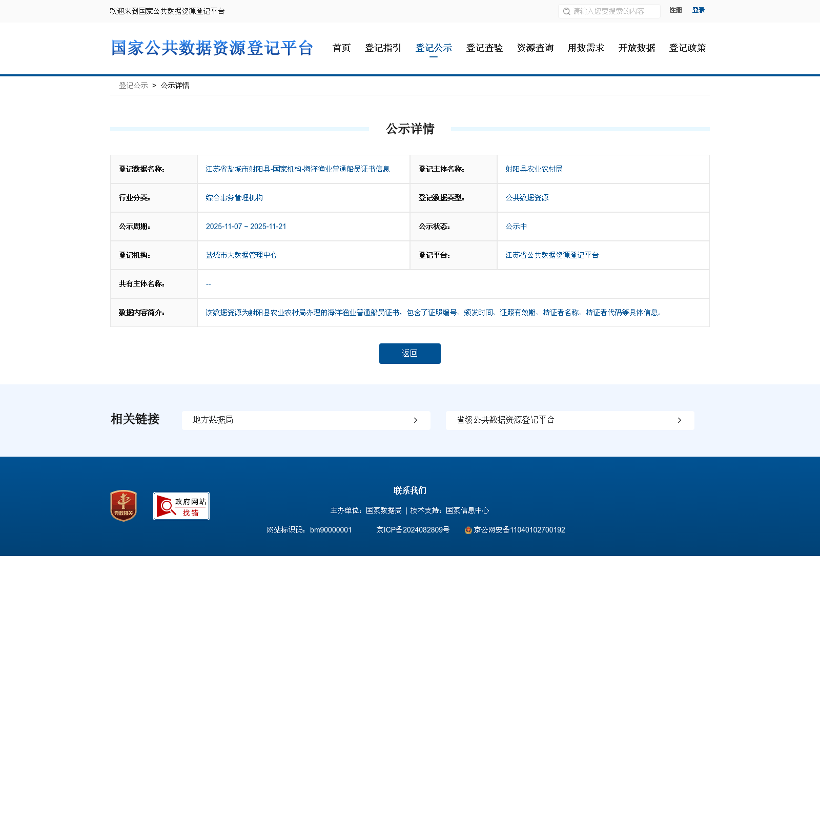 射阳县农业农村局 本次登记的公共数据资源 江苏省盐城市射阳县-国家机构-海洋渔业普通船员证书信息, 该数据资源为射阳县农业农村局办理的海洋渔业普通船员证书,包含了证照编号、颁发时间、证照有效期、持证者名称、持证者代码等具体信息。