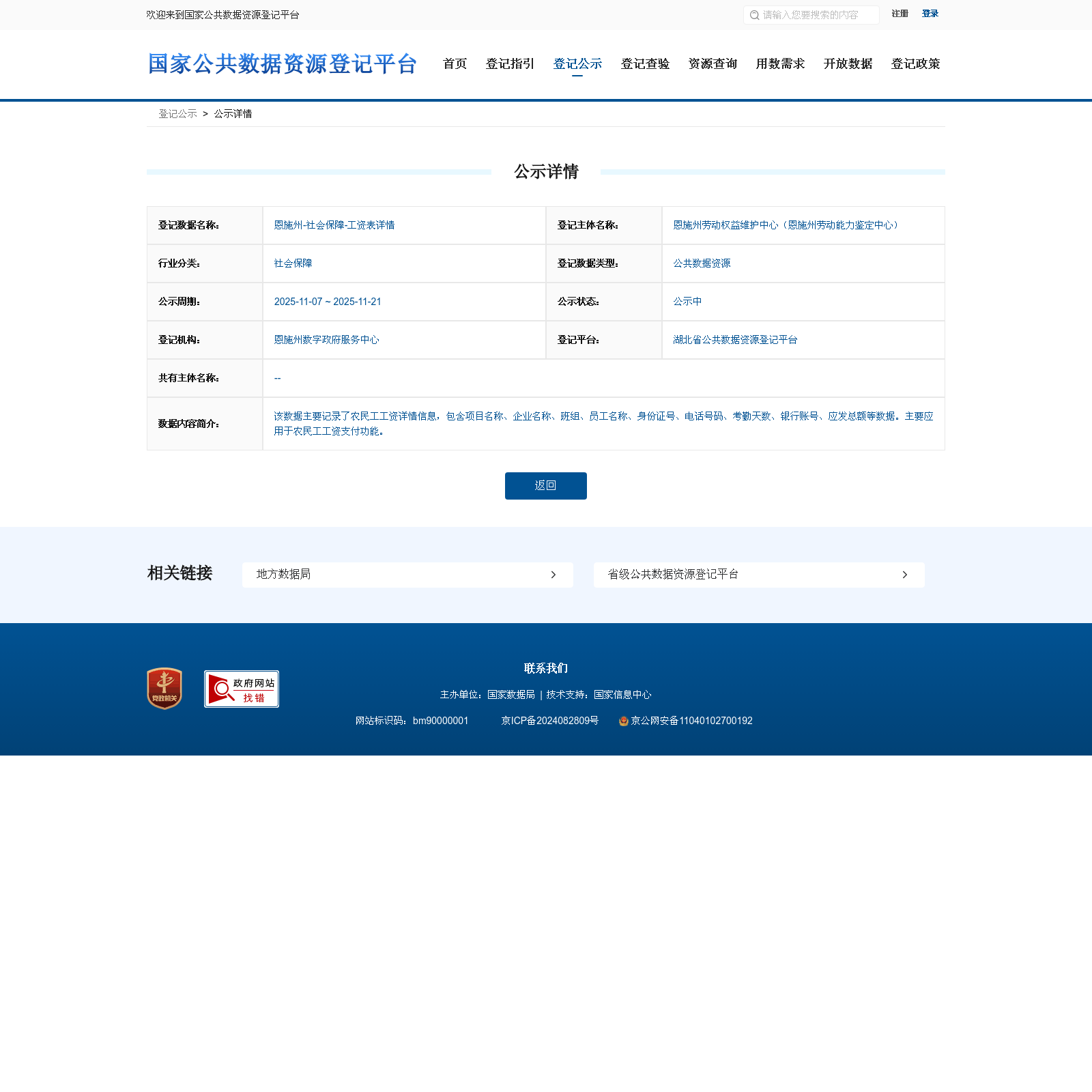 恩施州劳动权益维护中心(恩施州劳动能力鉴定中心) 本次登记的公共数据资源 恩施州-社会保障-工资表详情, 该数据主要记录了农民工工资详情信息,包含项目名称、企业名称、班组、员工名称、身份证号、电话号码、考勤天数、银行账号、应发总额等数据。主要应用于农民工工资支付功能。