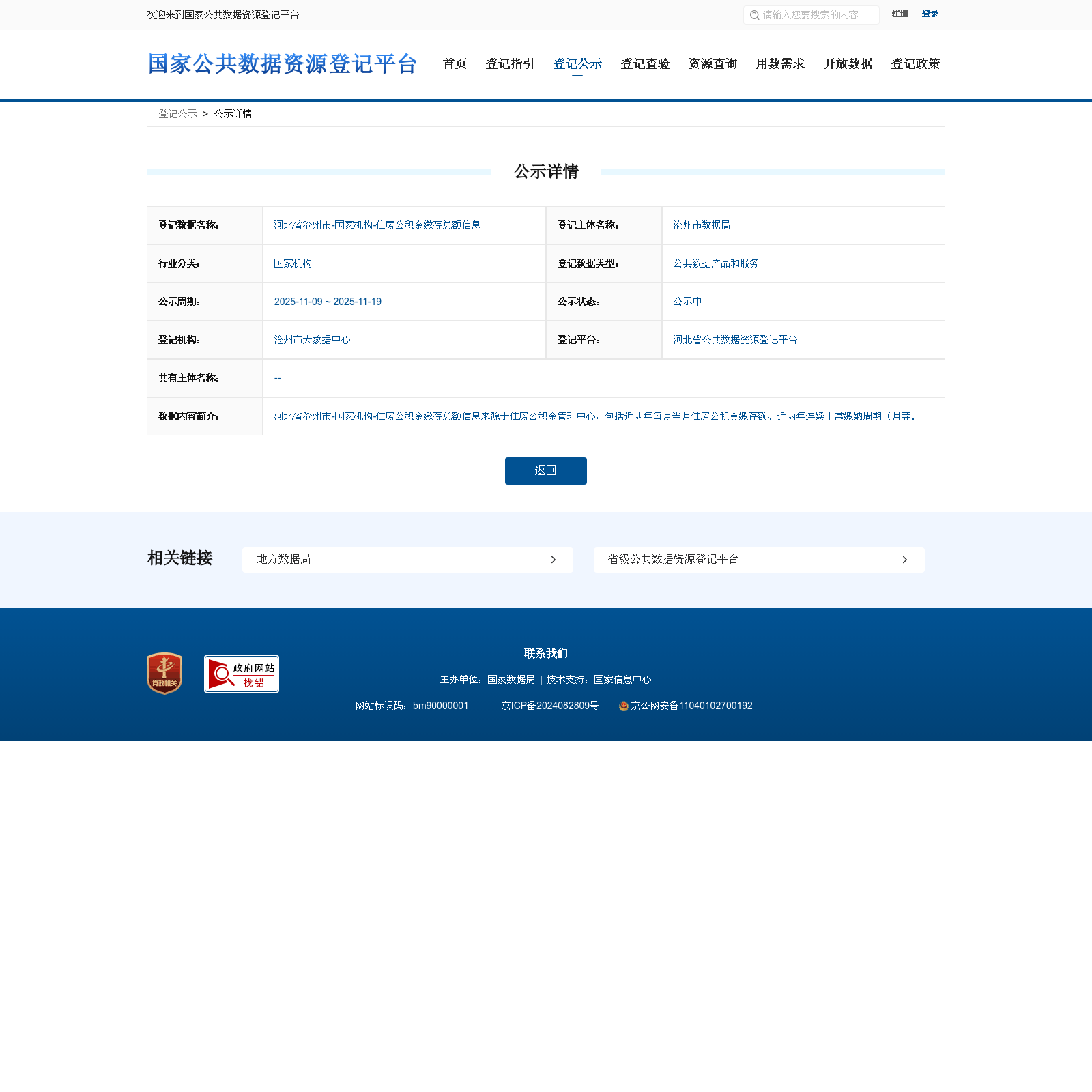 沧州市数据局 本次登记的公共数据资源 河北省沧州市-国家机构-住房公积金缴存总额信息, 河北省沧州市-国家机构-住房公积金缴存总额信息来源于住房公积金管理中心,包括近两年每月当月住房公积金缴存额、近两年连续正常缴纳周期(月等。