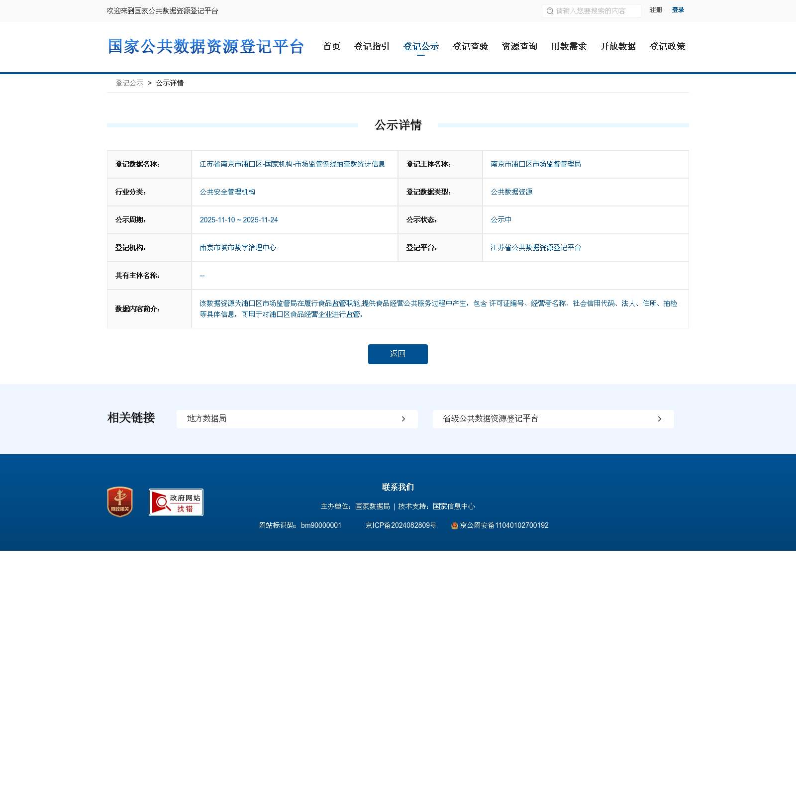 南京市浦口区市场监督管理局 本次登记的公共数据资源 江苏省南京市浦口区-国家机构-市场监管条线抽查数统计信息, 该数据资源为浦口区市场监管局在履行食品监管职能,提供食品经营公共服务过程中产生,包含 许可证编号、经营者名称、社会信用代码、法人、住所、抽检等具体信息,可用于对浦口区食品经营企业进行监管。