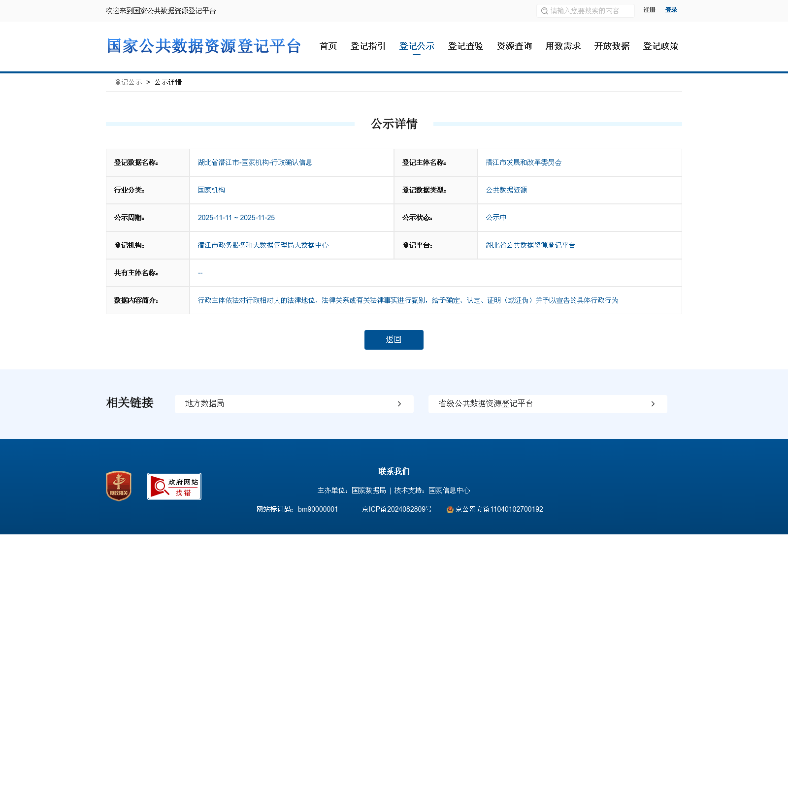 潜江市发展和改革委员会 本次登记的公共数据资源 湖北省潜江市-国家机构-行政确认信息, 行政主体依法对行政相对人的法律地位、法律关系或有关法律事实进行甄别,给予确定、认定、证明(或证伪)并予以宣告的具体行政行为