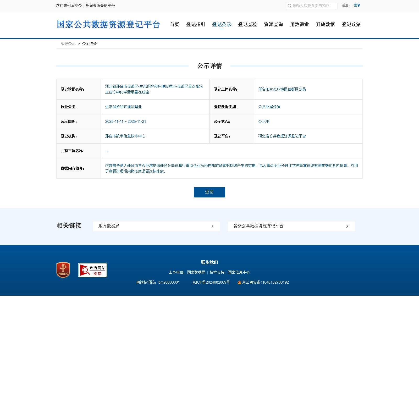 邢台市生态环境局信都区分局 本次登记的公共数据资源 河北省邢台市信都区-生态保护和环境治理业-信都区重点排污企业分钟化学需氧量在线监, 该数据资源为邢台市生态环境局信都区分局在履行重点企业污染物排放监管职权时产生的数据,包含重点企业分钟化学需氧量在线监测数据的具体信息,可用于查看该项污染物浓度是否达标排放。