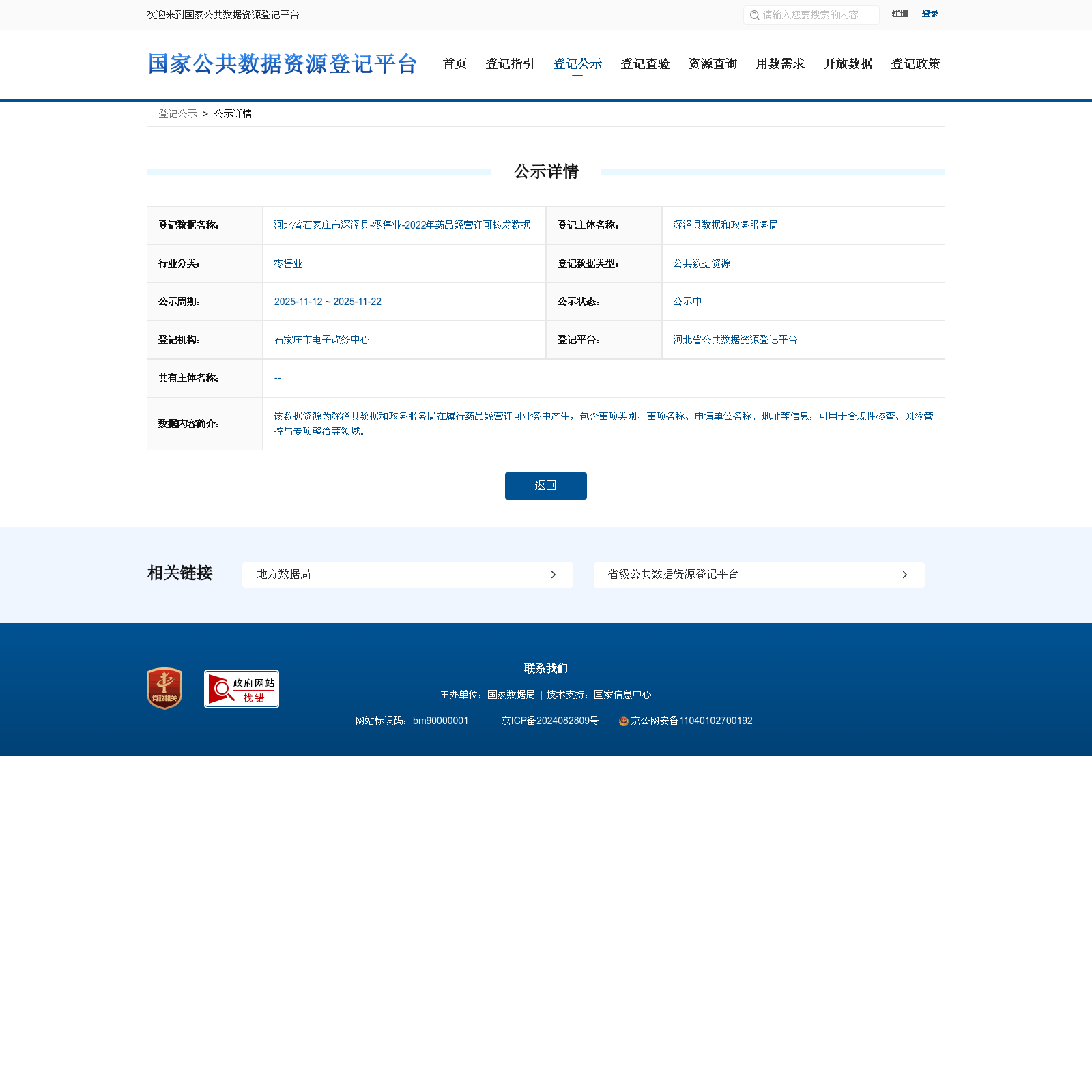 深泽县数据和政务服务局 本次登记的公共数据资源 河北省石家庄市深泽县-零售业-2022年药品经营许可核发数据, 该数据资源为深泽县数据和政务服务局在履行药品经营许可业务中产生,包含事项类别、事项名称、申请单位名称、地址等信息,可用于合规性核查、风险管控与专项整治等领域。