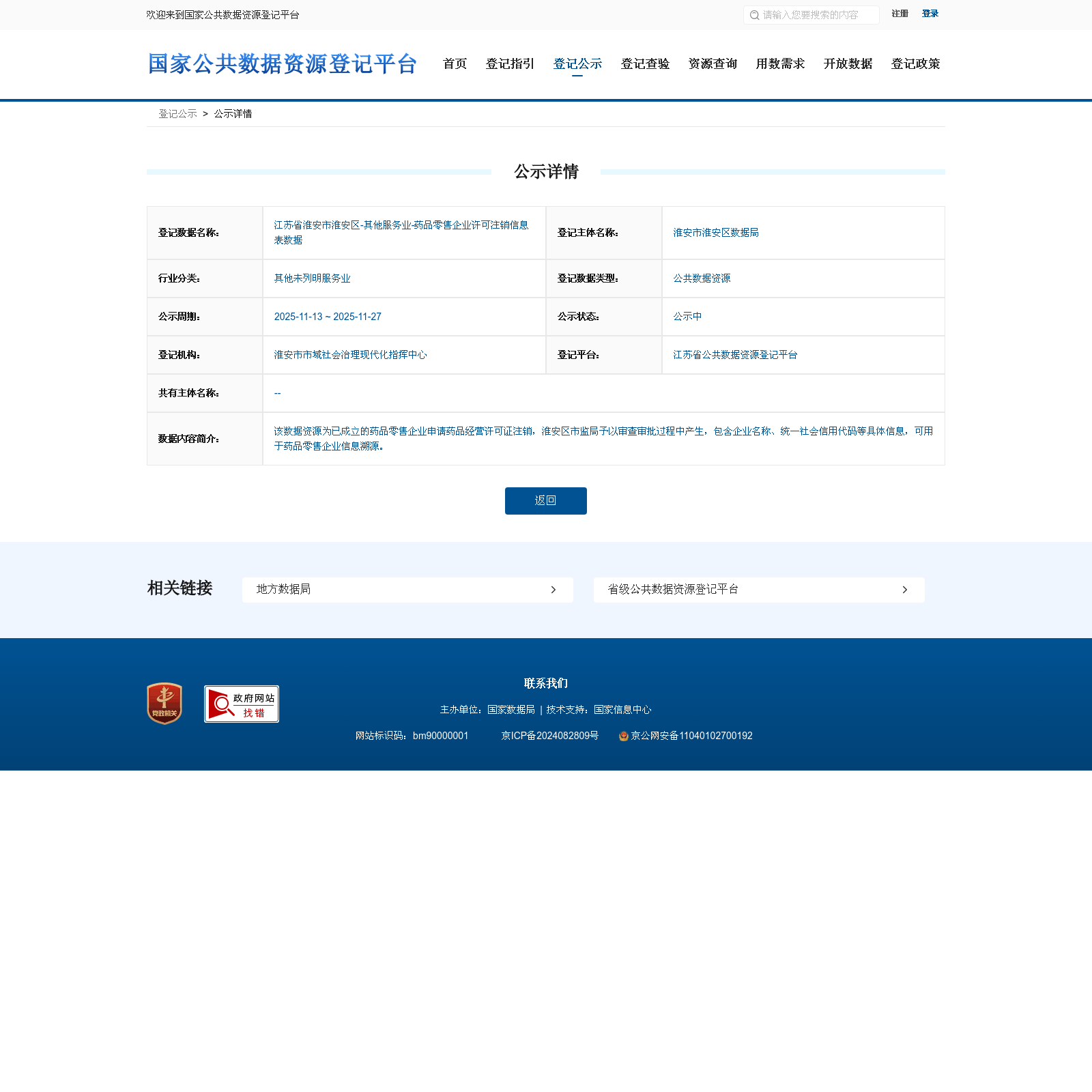 淮安市淮安区数据局 本次登记的公共数据资源 江苏省淮安市淮安区-其他服务业-药品零售企业许可注销信息表数据, 该数据资源为已成立的药品零售企业申请药品经营许可证注销,淮安区市监局予以审查审批过程中产生,包含企业名称、统一社会信用代码等具体信息,可用于药品零售企业信息溯源。