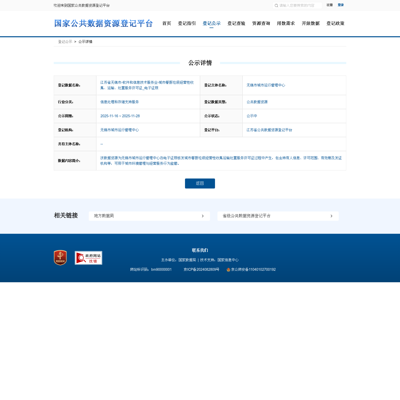 无锡市城市运行管理中心 本次登记的公共数据资源 江苏省无锡市-软件和信息技术服务业-城市餐厨垃圾经营性收集、运输、处置服务许可证_电子证照, 该数据资源为无锡市城市运行管理中心在电子证照核发城市餐厨垃圾经营性收集运输处置服务许可证过程中产生,包含持有人信息、许可范围、有效期及发证机构等,可用于城市环境管理与经营服务行为监管。