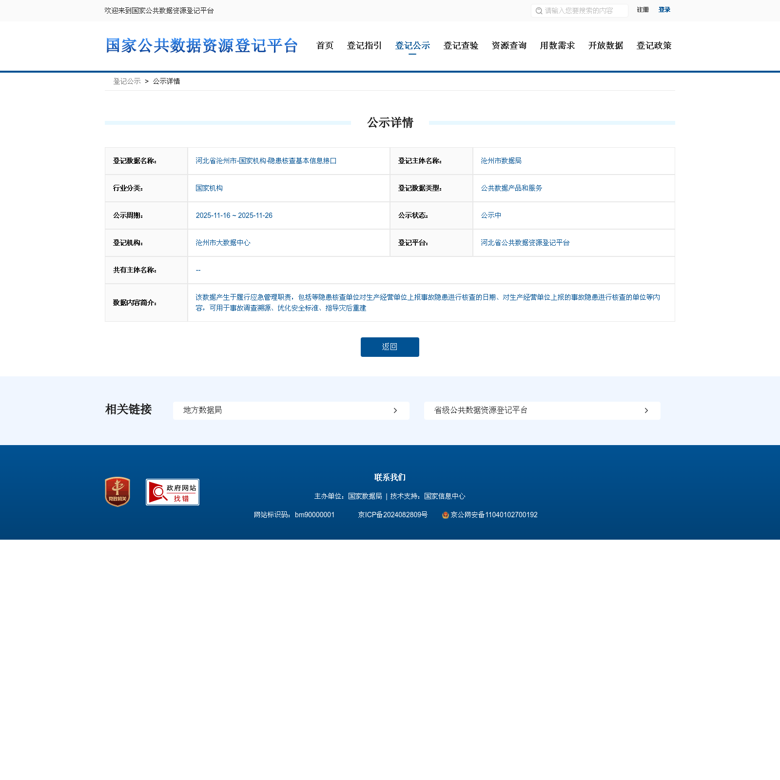 沧州市数据局 本次登记的公共数据资源 河北省沧州市-国家机构-隐患核查基本信息接口, 该数据产生于履行应急管理职责,包括等隐患核查单位对生产经营单位上报事故隐患进行核查的日期、对生产经营单位上报的事故隐患进行核查的单位等内容,可用于事故调查溯源、优化安全标准、指导灾后重建