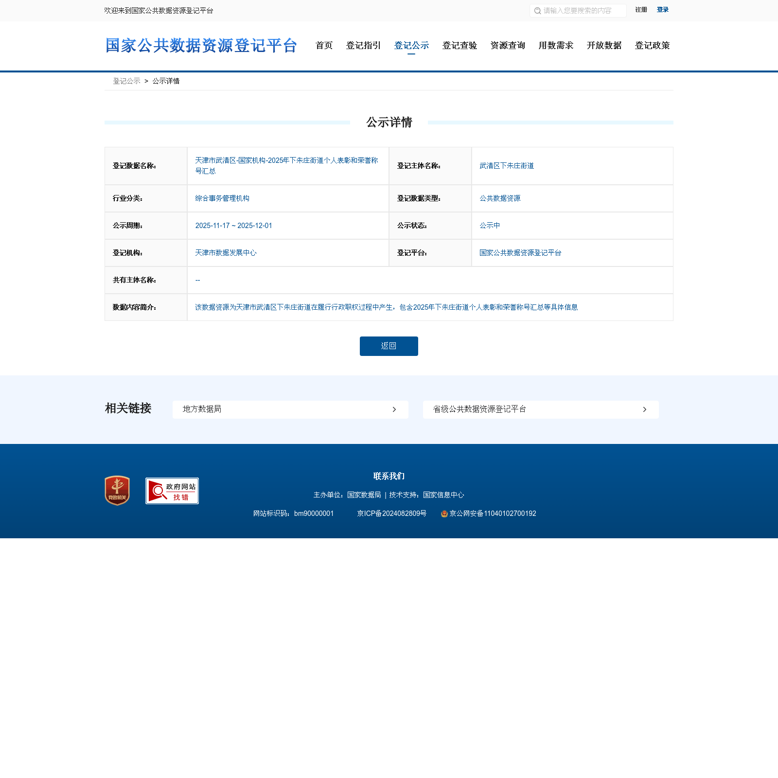 武清区下朱庄街道 本次登记的公共数据资源 天津市武清区-国家机构-2025年下朱庄街道个人表彰和荣誉称号汇总, 该数据资源为天津市武清区下朱庄街道在履行行政职权过程中产生,包含2025年下朱庄街道个人表彰和荣誉称号汇总等具体信息