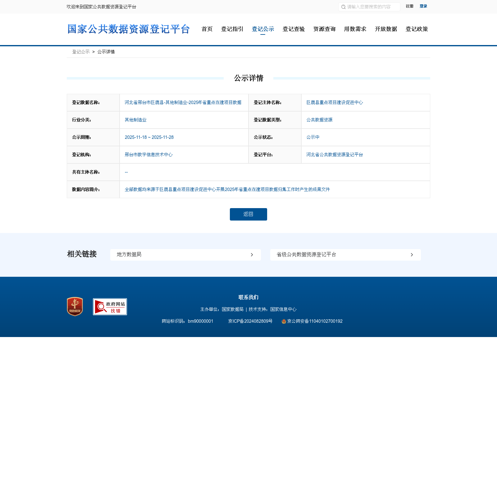 巨鹿县重点项目建设促进中心 本次登记的公共数据资源 河北省邢台市巨鹿县-其他制造业-2025年省重点在建项目数据, 全部数据均来源于巨鹿县重点项目建设促进中心开展2025年省重点在建项目数据归集工作时产生的成果文件