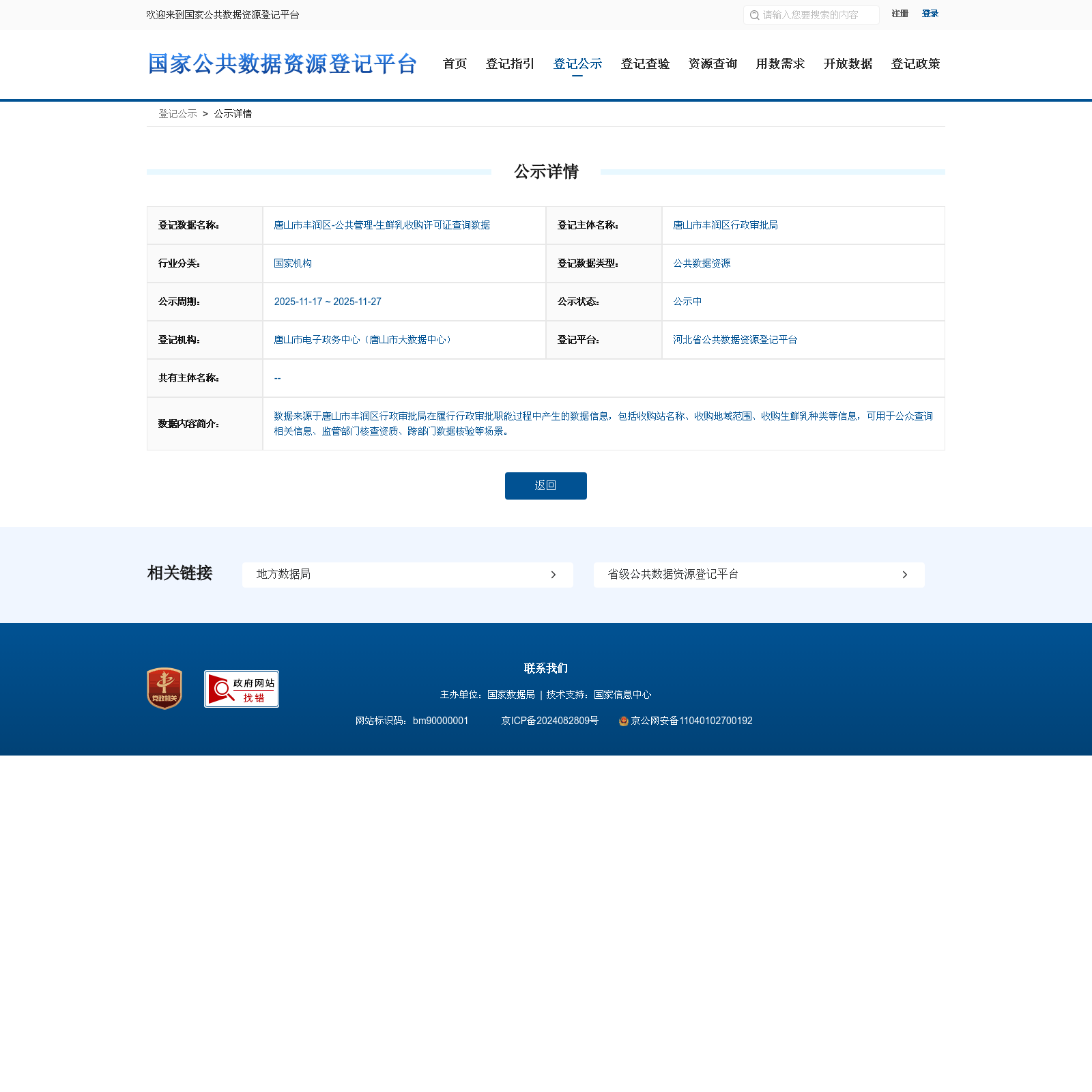 唐山市丰润区行政审批局 本次登记的公共数据资源 唐山市丰润区-公共管理-生鲜乳收购许可证查询数据, 数据来源于唐山市丰润区行政审批局在履行行政审批职能过程中产生的数据信息,包括收购站名称、收购地域范围、收购生鲜乳种类等信息,可用于公众查询相关信息、监管部门核查资质、跨部门数据核验等场景。