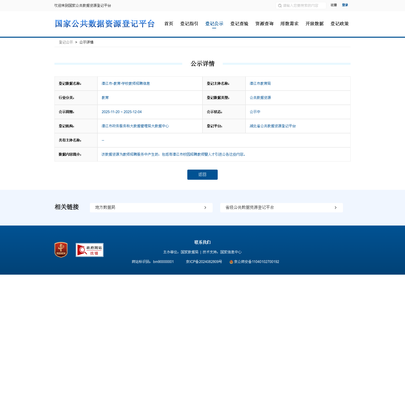 潜江市教育局 本次登记的公共数据资源 潜江市-教育-学校教师招聘信息, 该数据资源为教师招聘服务中产生的,包括有潜江市校园招聘教师暨人才引进公告这些内容。