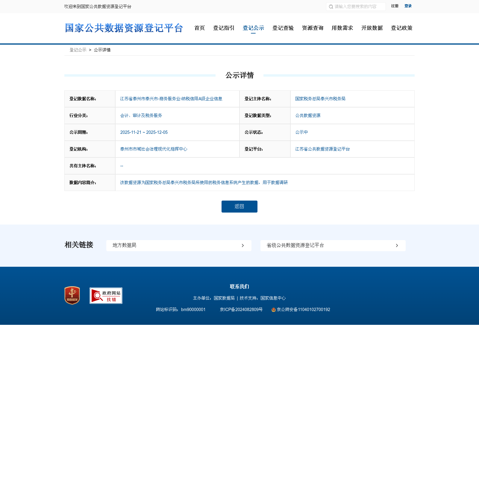国家税务总局泰兴市税务局 本次登记的公共数据资源 江苏省泰州市泰兴市-商务服务业-纳税信用A级企业信息, 该数据资源为国家税务总局泰兴市税务局所使用的税务信息系统产生的数据,用于数据调研
