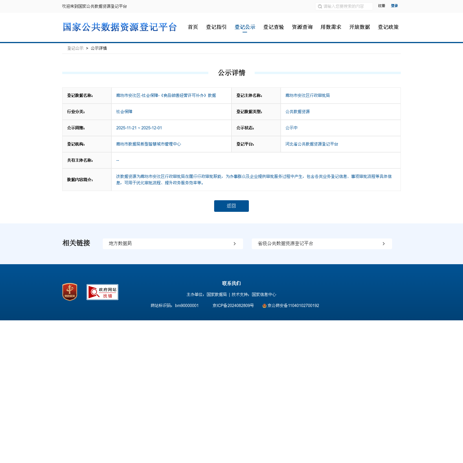 廊坊市安次区行政审批局 本次登记的公共数据资源 廊坊市安次区-社会保障-《食品销售经营许可补办》数据, 该数据资源为廊坊市安次区行政审批局在履行行政审批职能,为办事群众及企业提供审批服务过程中产生,包含各类业务登记信息、事项审批流程等具体信息,可用于优化审批流程、提升政务服务效率等。