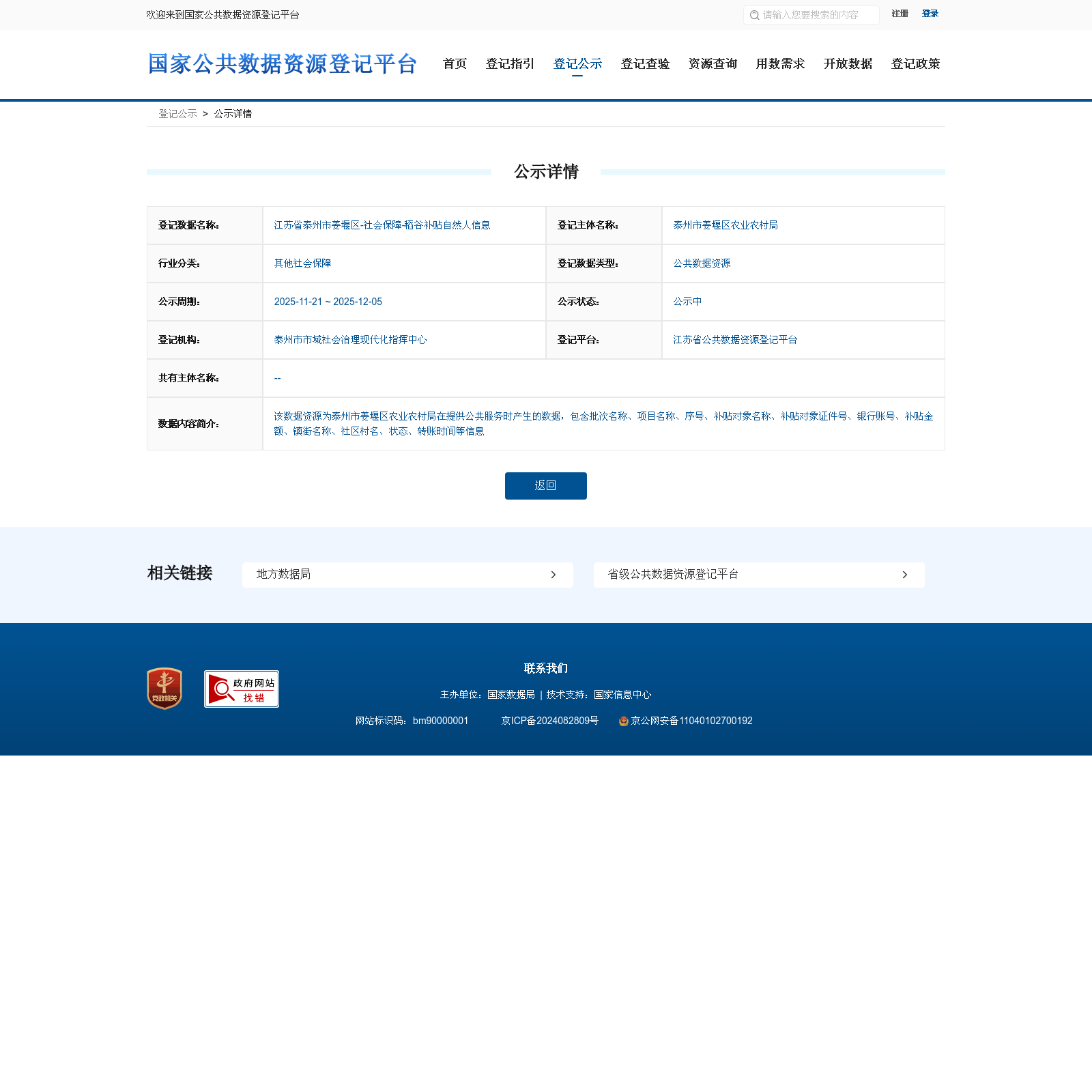 泰州市姜堰区农业农村局 本次登记的公共数据资源 江苏省泰州市姜堰区-社会保障-稻谷补贴自然人信息, 该数据资源为泰州市姜堰区农业农村局在提供公共服务时产生的数据,包含批次名称、项目名称、序号、补贴对象名称、补贴对象证件号、银行账号、补贴金额、镇街名称、社区村名、状态、转账时间等信息