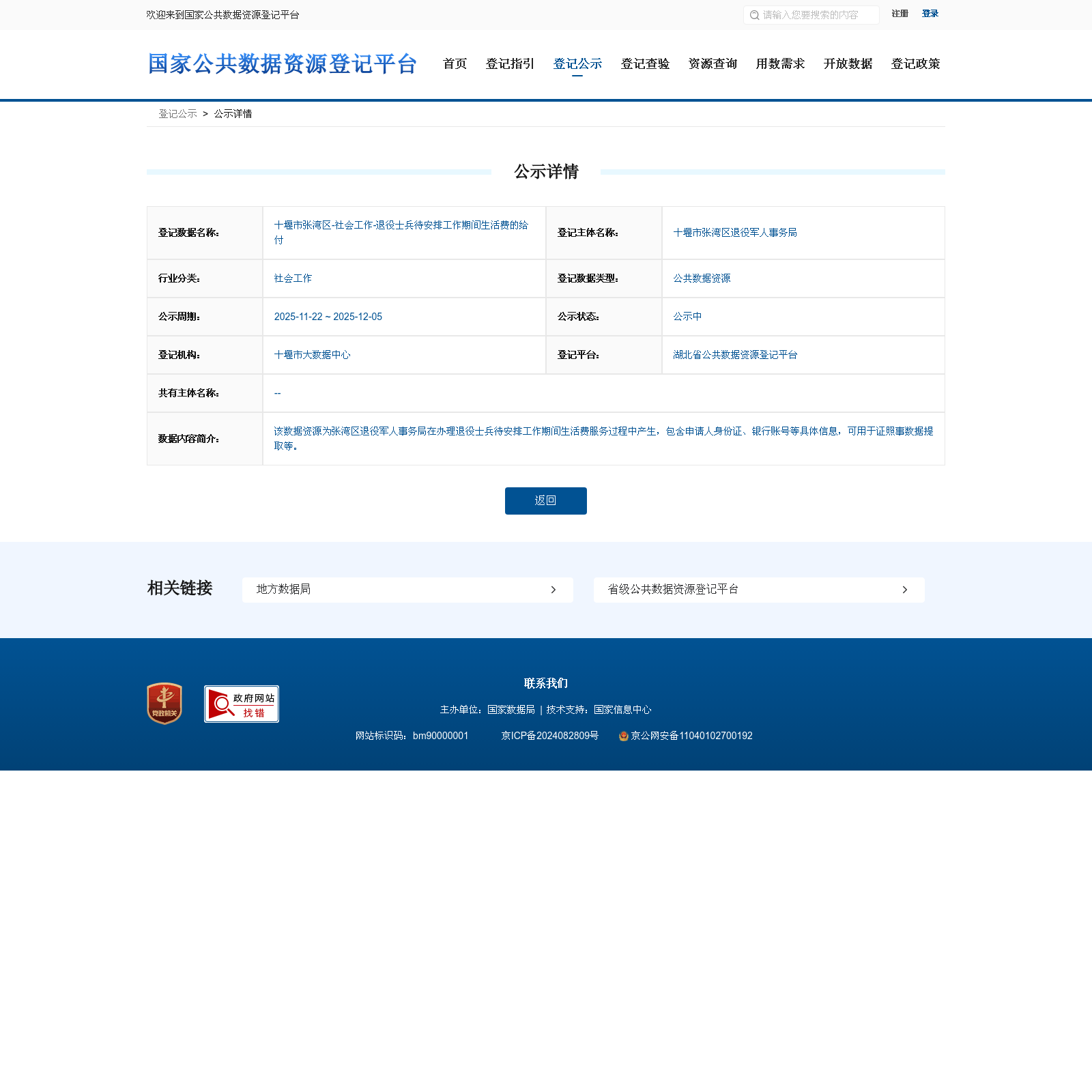 十堰市张湾区退役军人事务局 本次登记的公共数据资源 十堰市张湾区-社会工作-退役士兵待安排工作期间生活费的给付, 该数据资源为张湾区退役军人事务局在办理退役士兵待安排工作期间生活费服务过程中产生,包含申请人身份证、银行账号等具体信息,可用于证照事数据提取等。