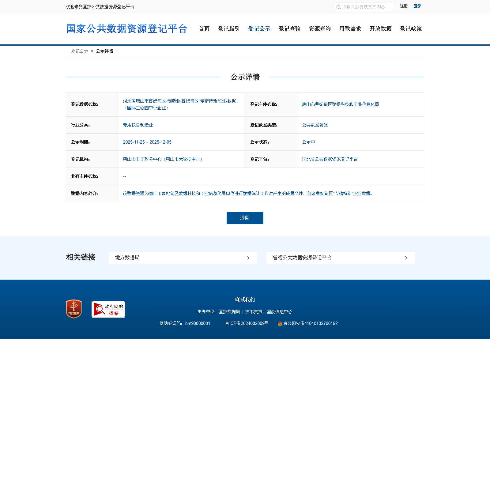 唐山市曹妃甸区数据科技和工业信息化局 本次登记的公共数据资源 河北省唐山市曹妃甸区-制造业-曹妃甸区“专精特新“企业数据(国际生态园中小企业), 该数据资源为唐山市曹妃甸区数据科技和工业信息化局单位进行数据统计工作时产生的成果文件,包含曹妃甸区“专精特新”企业数据。