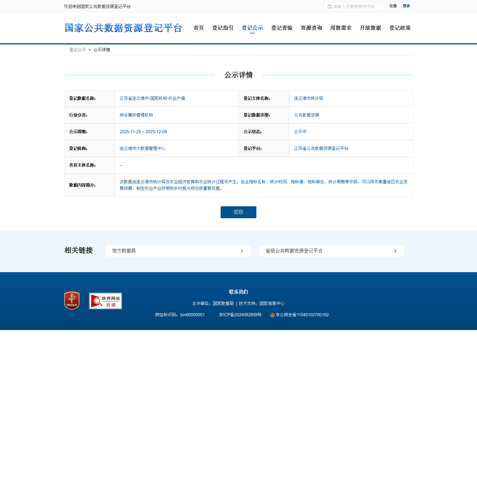 连云港市统计局 本次登记的公共数据资源 江苏省连云港市-国家机构-农业产值, 该数据由连云港市统计局在农业经济核算和农业统计过程中产生,包含指标名称、统计时间、指标值、指标单位、统计周期等字段,可以用作衡量地区农业发展规模、制定农业产业政策和乡村振兴规划的重要依据。