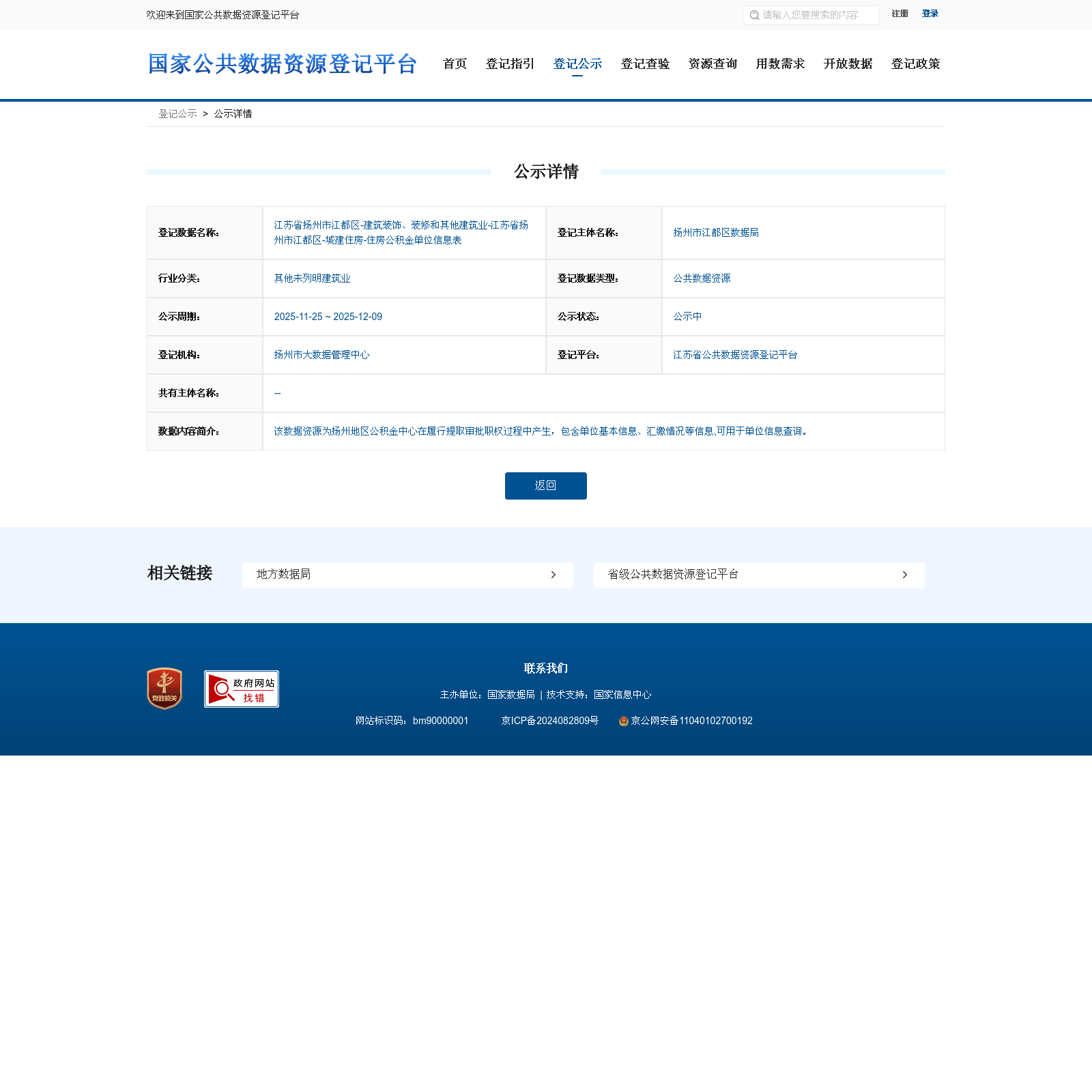 扬州市江都区数据局 本次登记的公共数据资源 江苏省扬州市江都区-建筑装饰、装修和其他建筑业-江苏省扬州市江都区-城建住房-住房公积金单位信息表, 该数据资源为扬州地区公积金中心在履行提取审批职权过程中产生,包含单位基本信息、汇缴情况等信息,可用于单位信息查询。