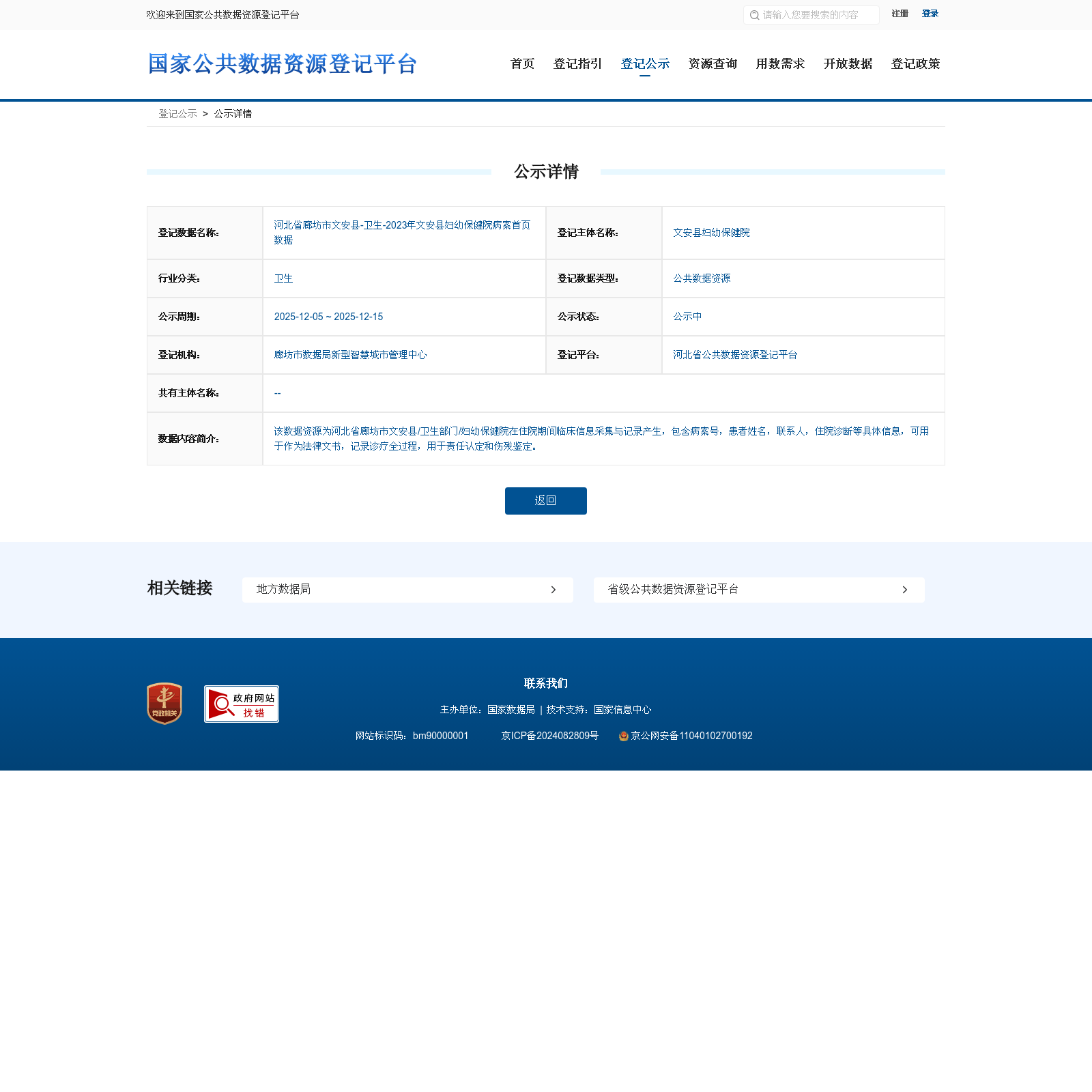 文安县妇幼保健院 本次登记的公共数据资源 河北省廊坊市文安县-卫生-2023年文安县妇幼保健院病案首页数据, 该数据资源为河北省廊坊市文安县/卫生部门/妇幼保健院在住院期间临床信息采集与记录产生,包含病案号,患者姓名,联系人,住院诊断等具体信息,可用于作为法律文书,记录诊疗全过程,用于责任认定和伤残鉴定。