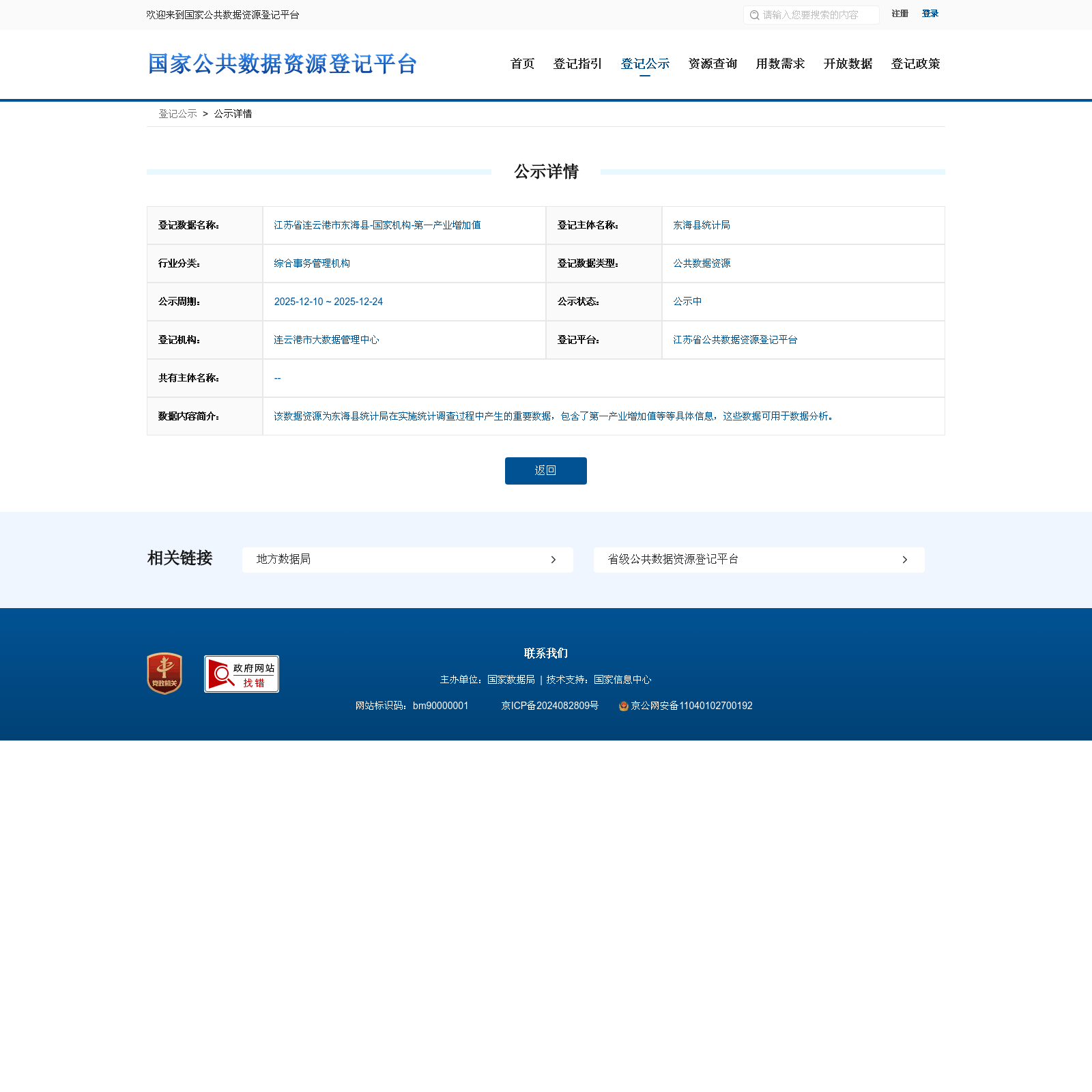 东海县统计局 本次登记的公共数据资源 江苏省连云港市东海县-国家机构-第一产业增加值, 该数据资源为东海县统计局在实施统计调查过程中产生的重要数据,包含了第一产业增加值等等具体信息,这些数据可用于数据分析。