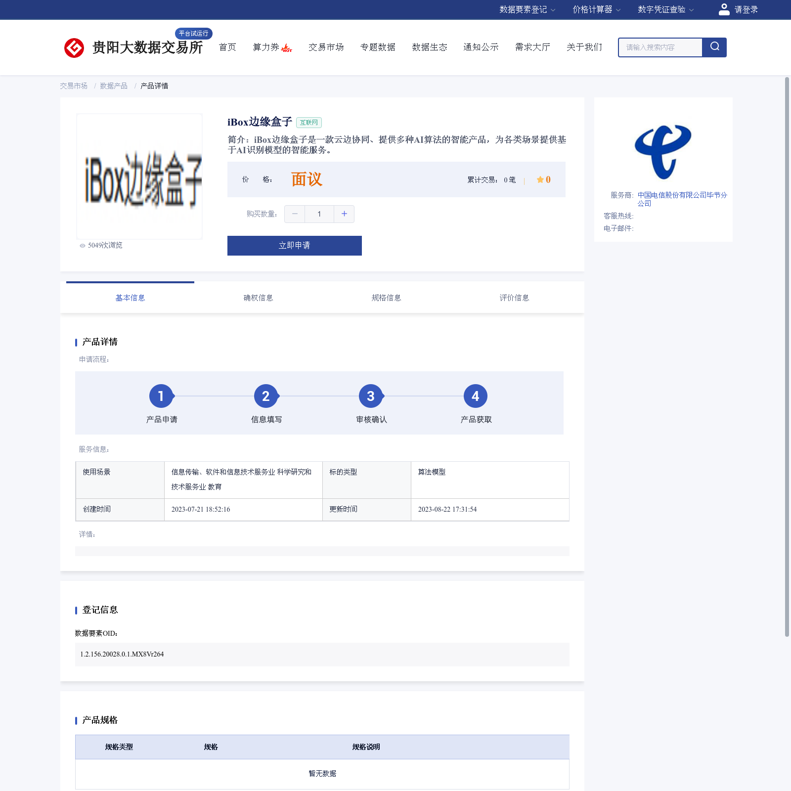 中国电信股份有限公司毕节分公司 本次上架的数据产品 iBox边缘盒子 , iBox边缘盒子是一款云边协同、提供多种AI算法的智能产品,为各类场景提供基于AI识别模型的智能服务。