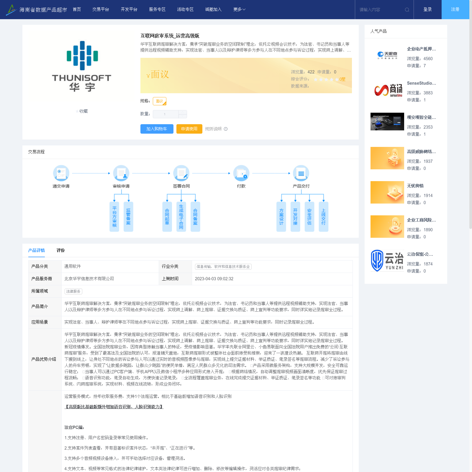 北京华宇信息技术有限公司 本次上架的数据产品 互联网庭审系统_运营高级版, 华宇互联网庭审解决方案,秉承“突破庭审业务的空间限制”理念,依托云视频会议技术,为法官、书记员和当事人等提供远程视频辅助支持,实现法官、当事人以及辩护律师等多方参与人在不同地点参与诉讼过程,实现网上调解、网上庭审、证据交换与质证、网上宣判等功能要求,同时详实地记录庭审全过程。