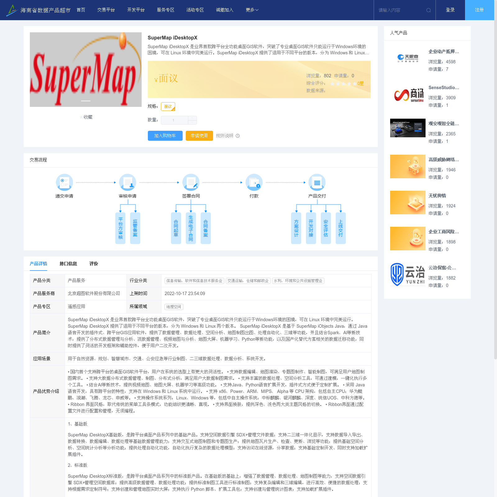 北京超图软件股份有限公司 本次上架的数据产品 SuperMap iDesktopX, SuperMap iDesktopX 是业界首款跨平台全功能桌面GIS软件,突破了专业桌面GIS软件只能运行于Windows环境的困境,可在 Linux 环境中完美运行。SuperMap iDesktopX 提供了适用于不同平台的版本,分为 Windows 和 Linux 两个版本。 SuperMap iDesktopX 是基于 SuperMap iObjects Java,通过 Java 语言开发的插件式、跨平台GIS应用软件,提供了数据管理、数据处理、空间分析、地图制图出图、处理自动化、三维等功能,并且结合Spark、AI等新技术,提供了分布式数据管理与分析、流数据管理、视频地图与分析、地图大屏、机器学习、Python等新功能,以及国产化替代方案相关的数据迁移功能,同时提供了灵活的开发框架和辅助控件,便于用户二次开发。
